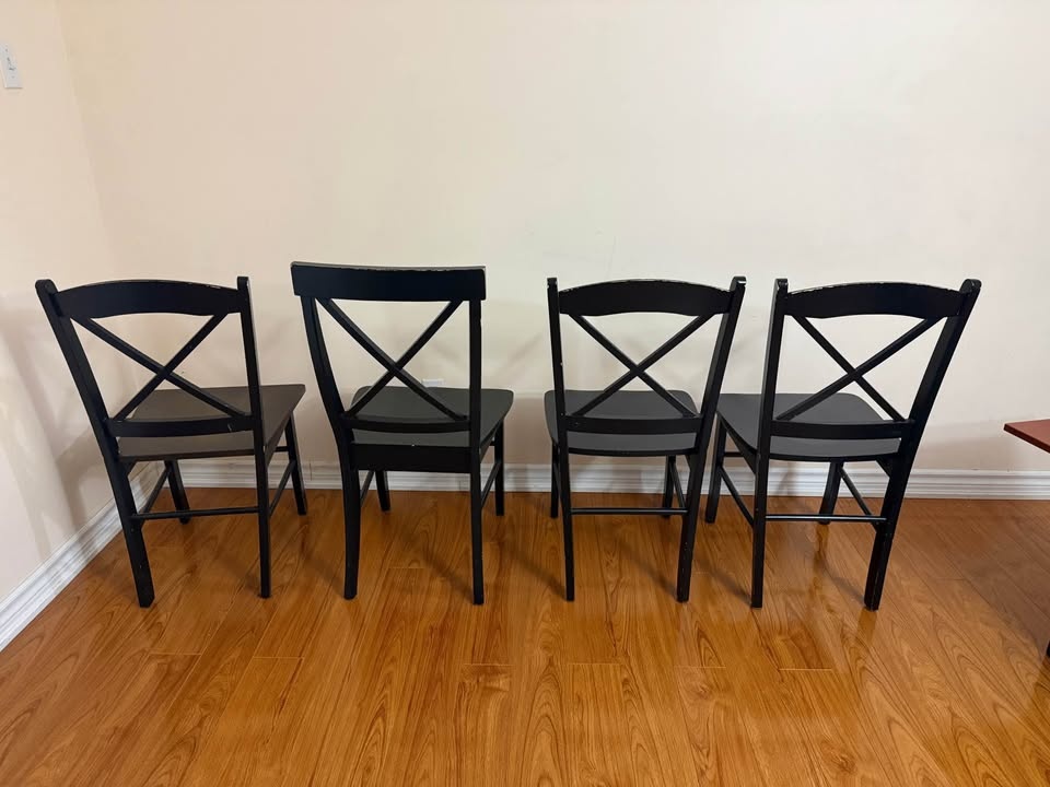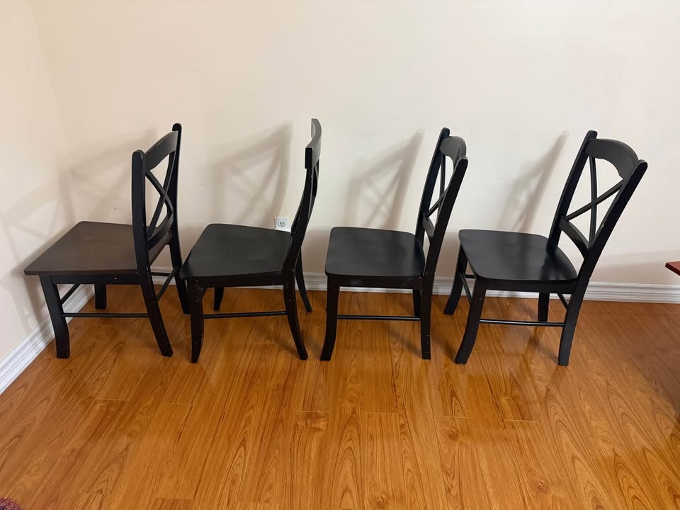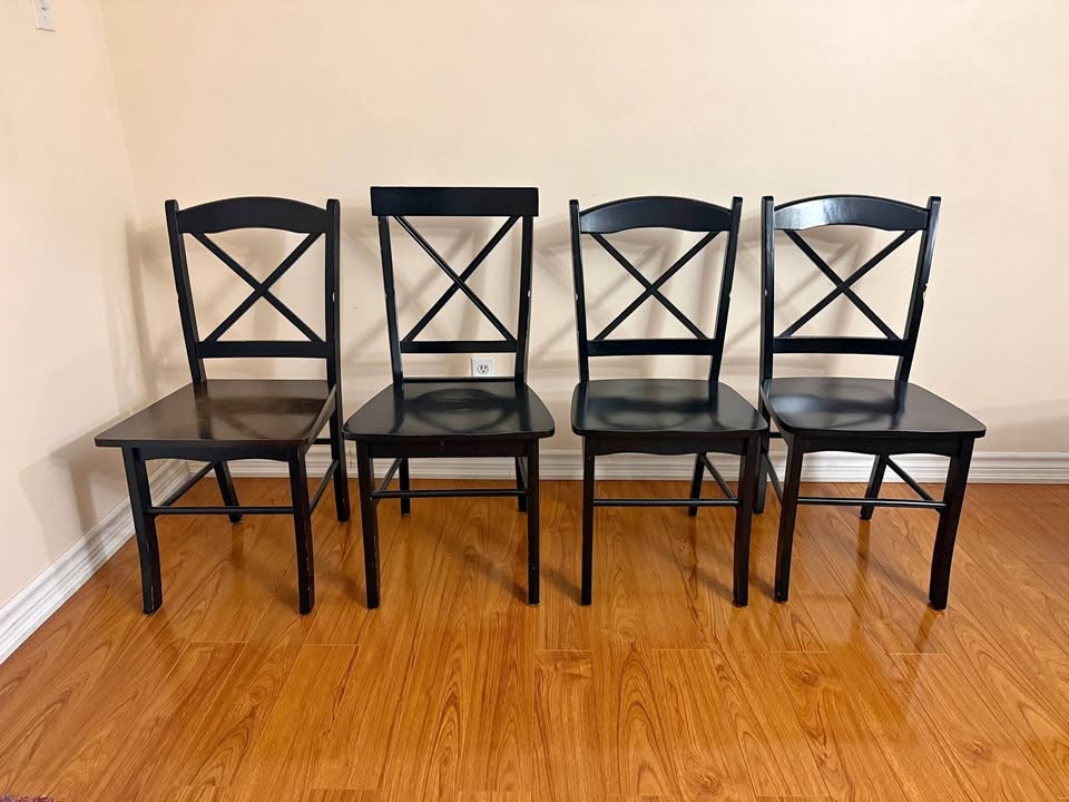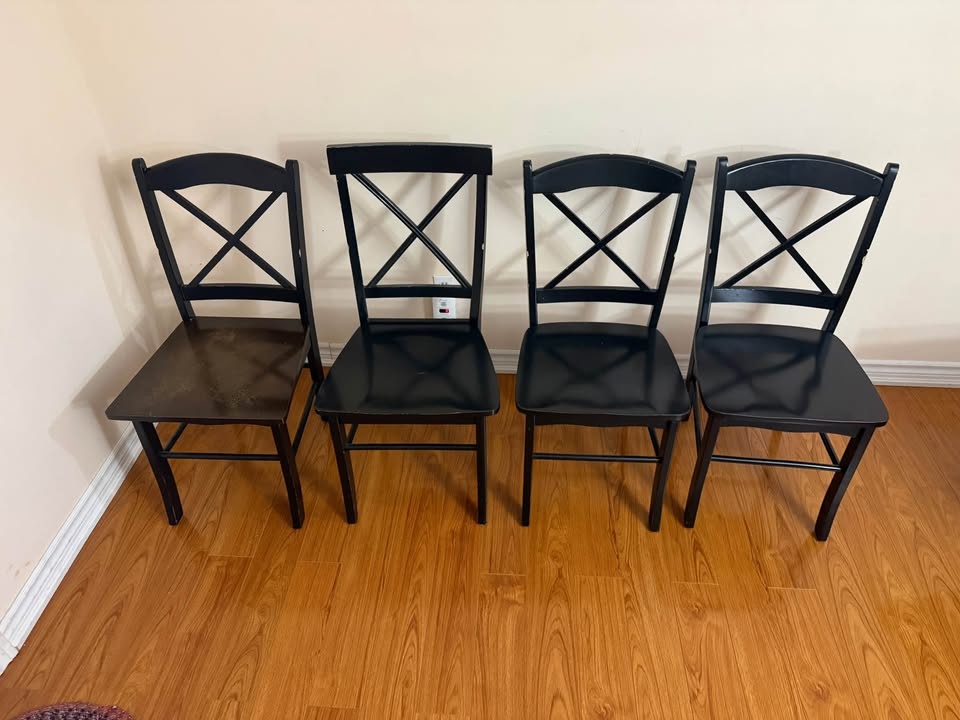Selling this set of 4 black wooden dining chairs. They are sturdy and solid, perfect for a dining room or as extra seating.