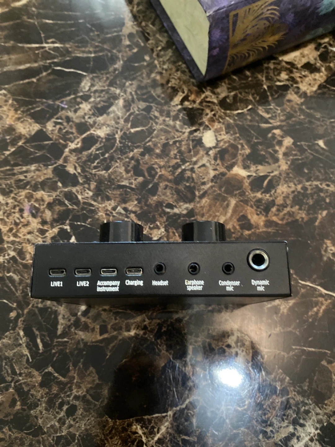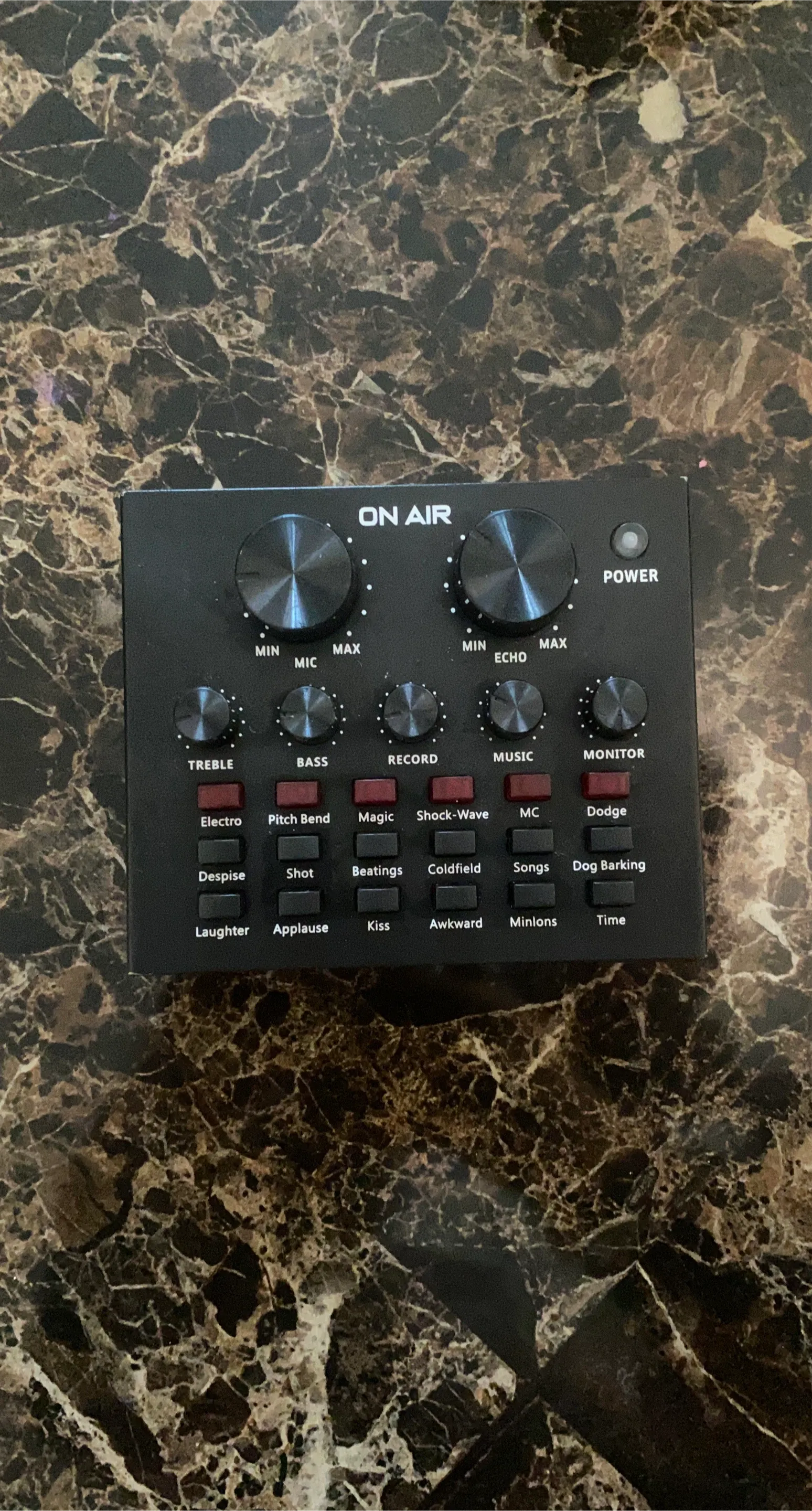 Selling an On Air sound mixer! It has inputs for Live 1, Live 2, an accompanying instrument, charging, headset, earphone speaker, condenser mic, and a dynamic mic. It also has controls for treble, bass, record, music, and monitor. There are also sound effect buttons for electro, pitch bend, magic, shock-wave, mc, dodge, despise, shot, beatings, coldfield, songs, dog barking, laughter, applause, kiss, awkward, and minions