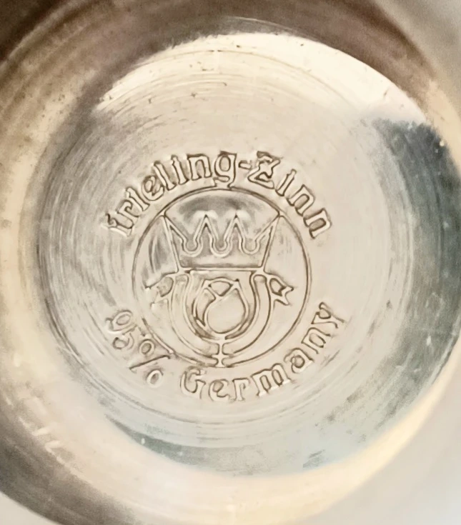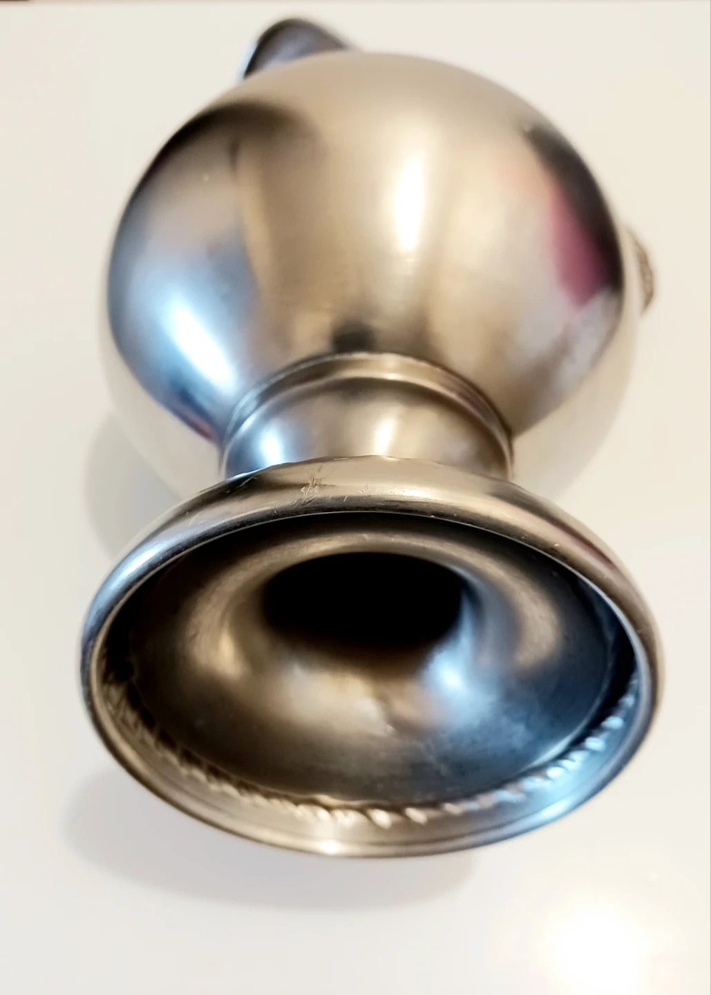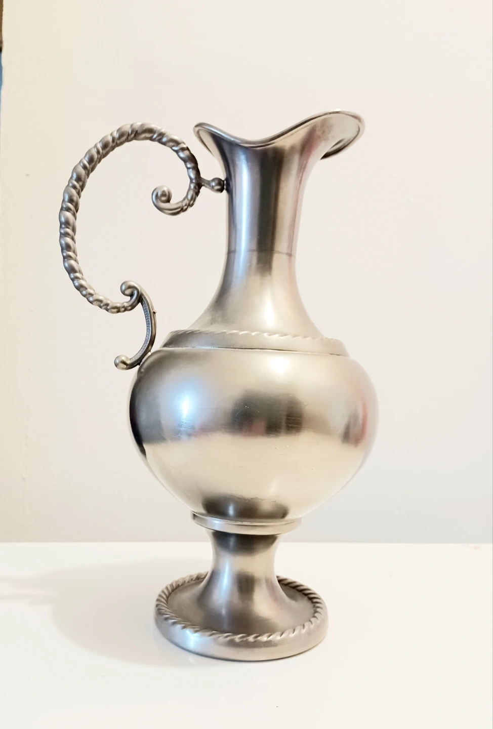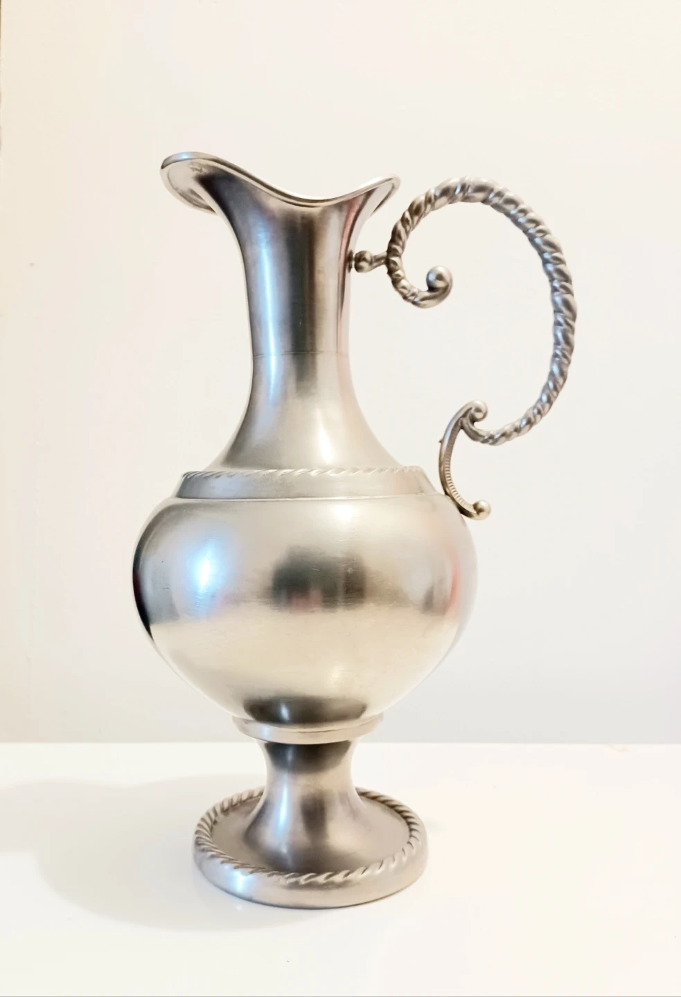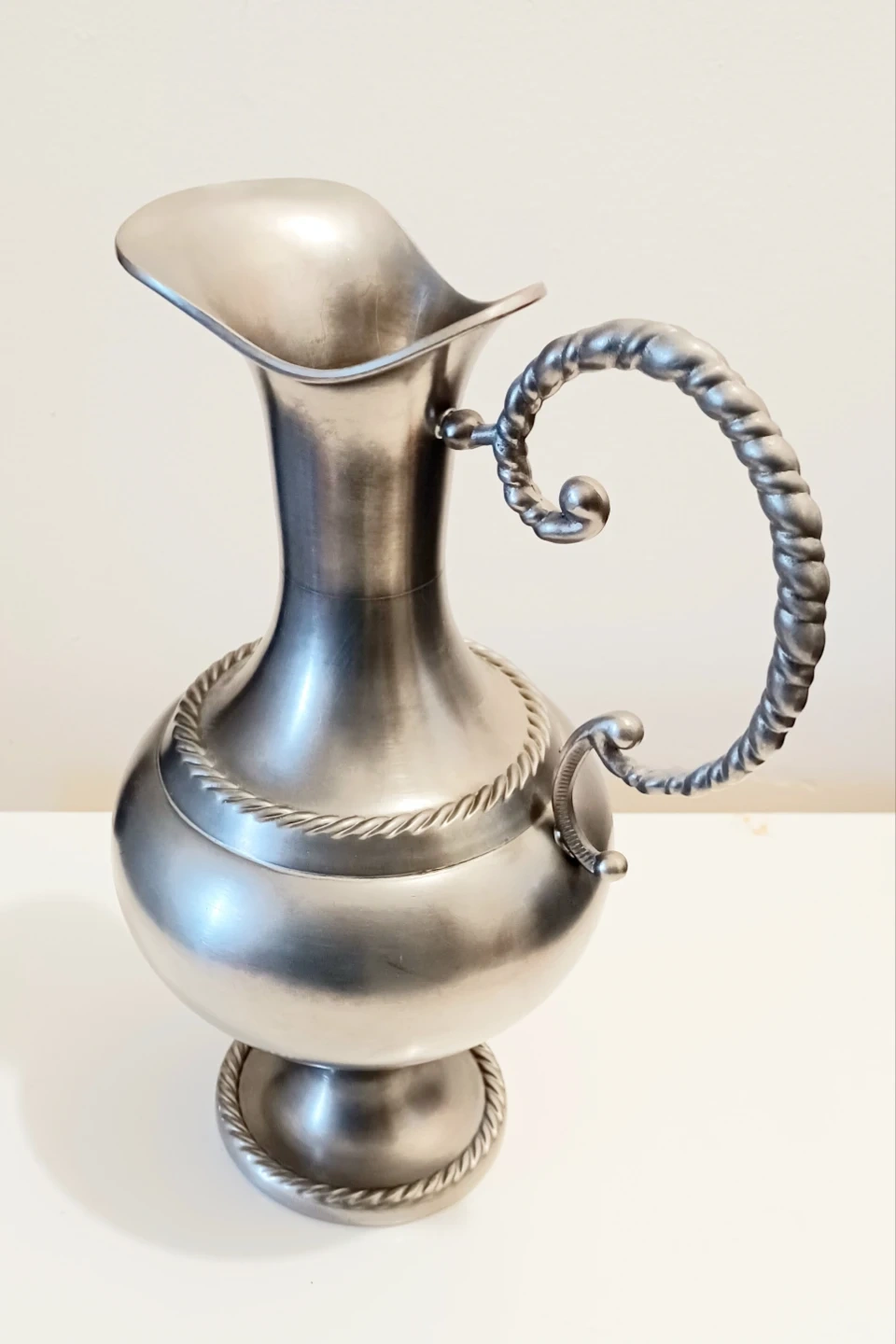 Elegant Irtelling-Zinn pitcher, made in Germany, features a beautiful pewter finish and a Unique Twisted Handle design. It's a charming piece that adds a touch of vintage flair to any setting.