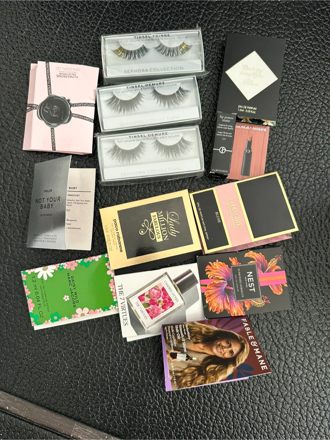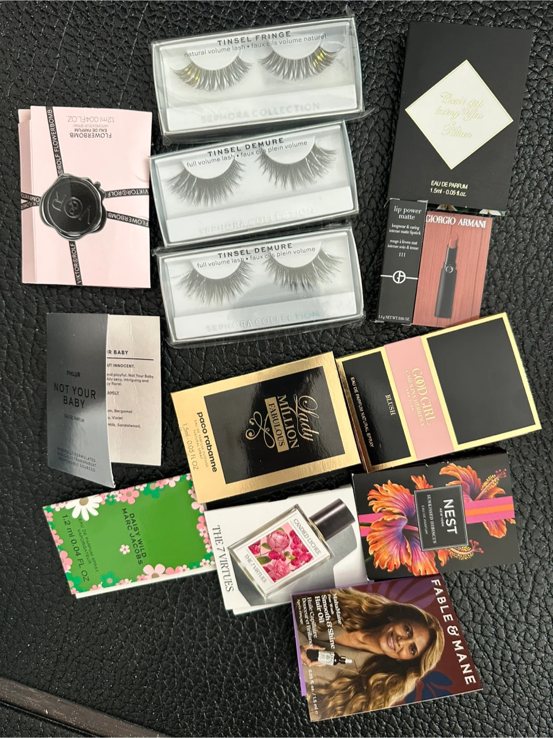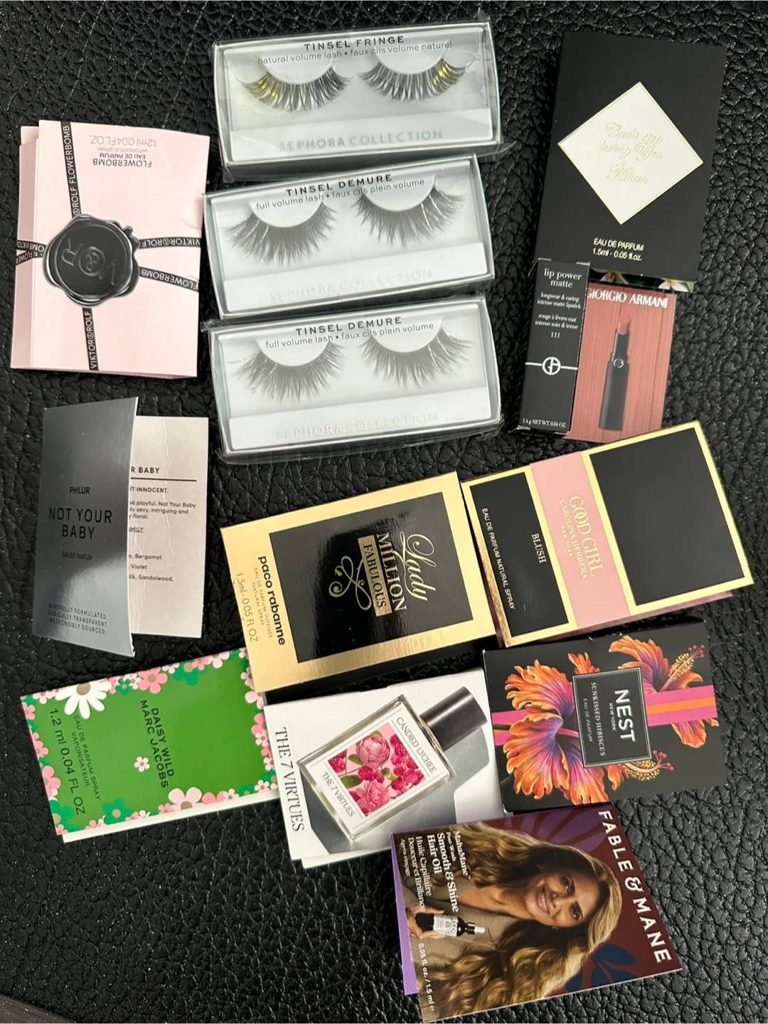 A collection of various perfume and beauty samples. Includes brands like Sephora Collection, Kilian, Giorgio Armani, Phlur, Paco Rabanne, Marc Jacobs, Nest, and Fable & Mane. Perfect for trying out new scents and beauty products!