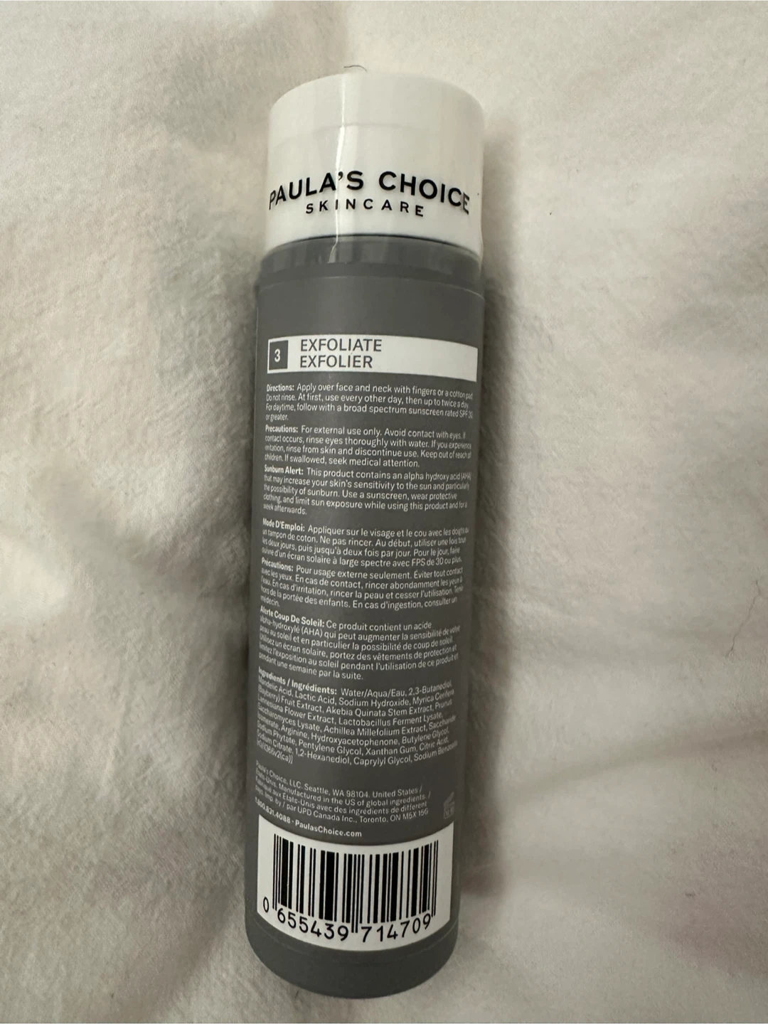 Selling a Paula's Choice Skin Perfecting 6% Mandelic Acid + 2% Lactic Acid Liquid Exfoliant. This is a liquid exfoliant that visibly improves skin barrier discoloration from sun damage. It comes in an 88 ml bottle