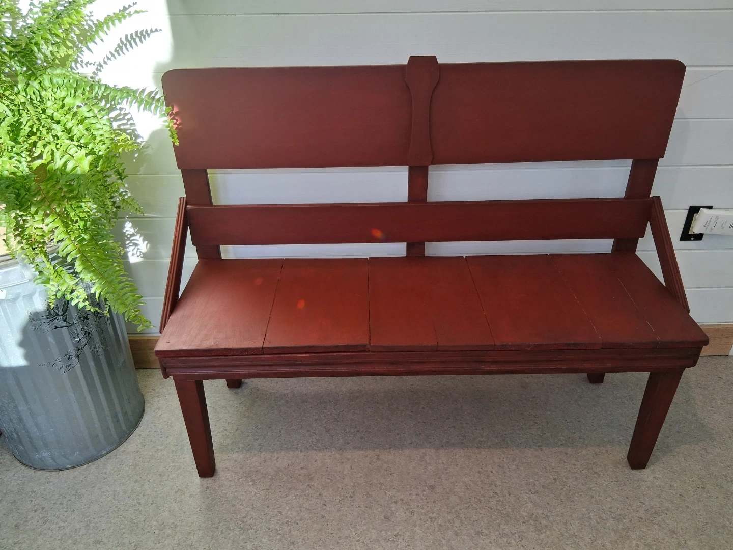 Selling a charming red wooden bench. It's a sturdy piece perfect for an entryway or garden. The bench has a unique design and a warm, inviting colour that would complement any space.