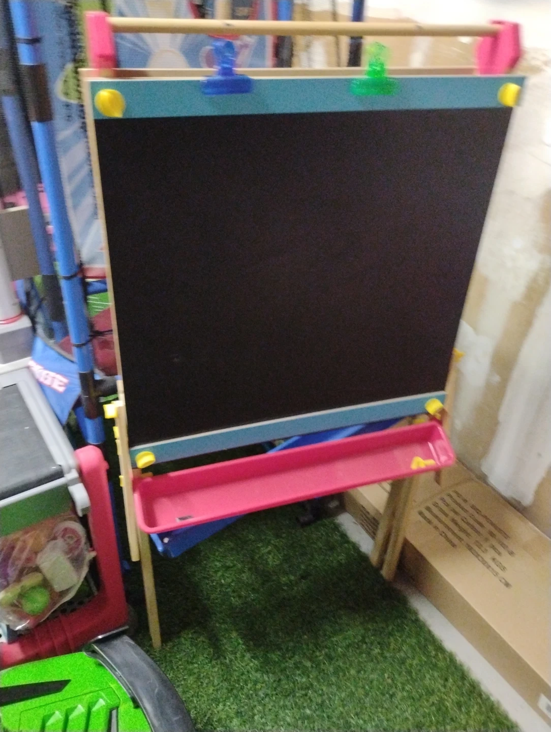 Giving away kids' easel with a chalkboard. It features colorful accents and a tray for holding art supplies. Great for creative play! Pick up only