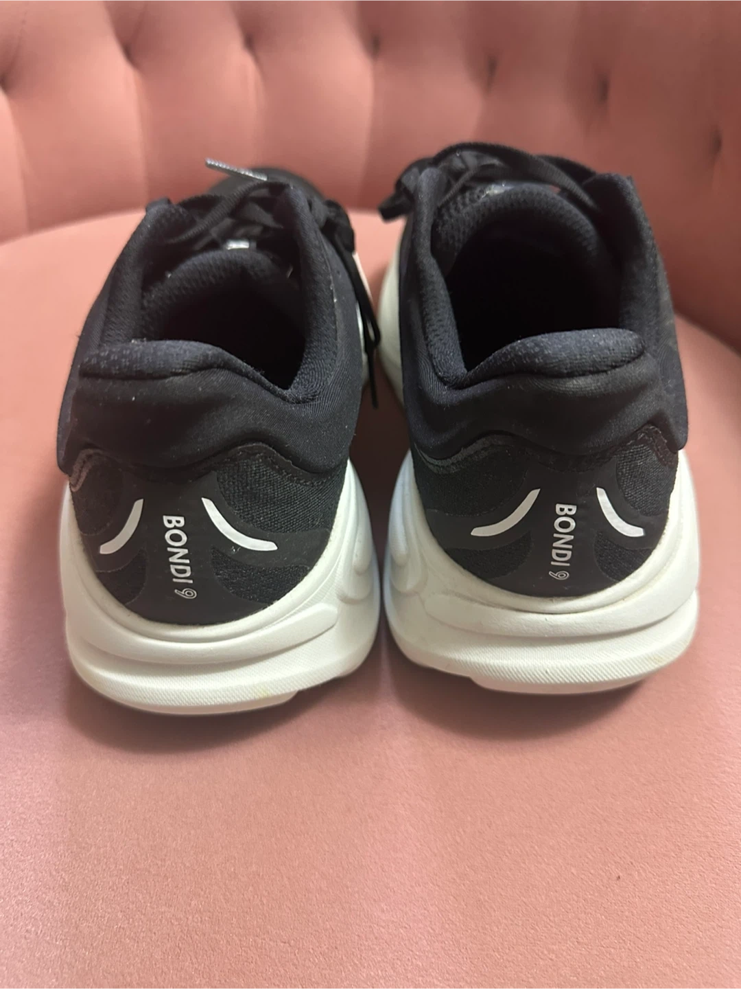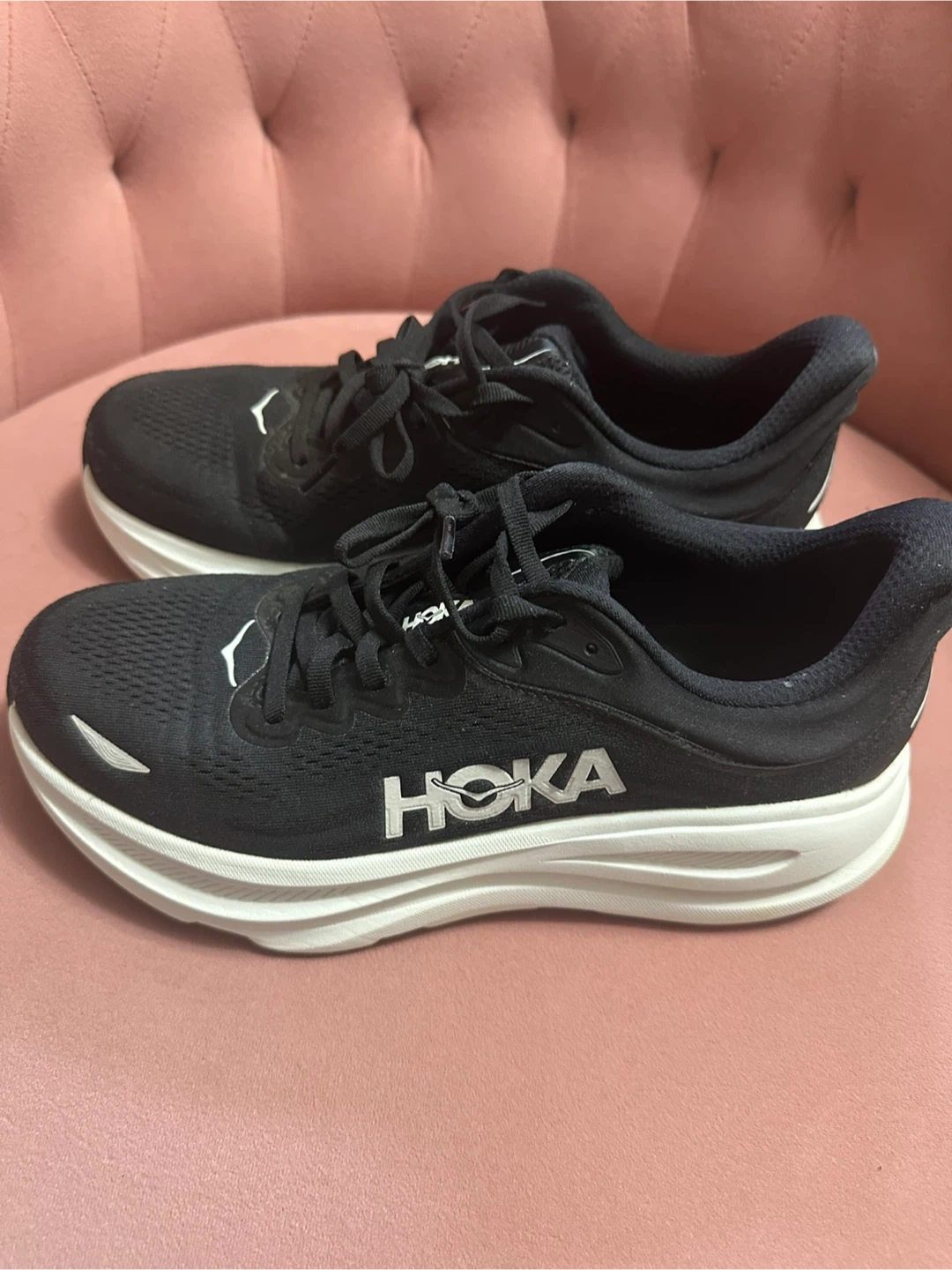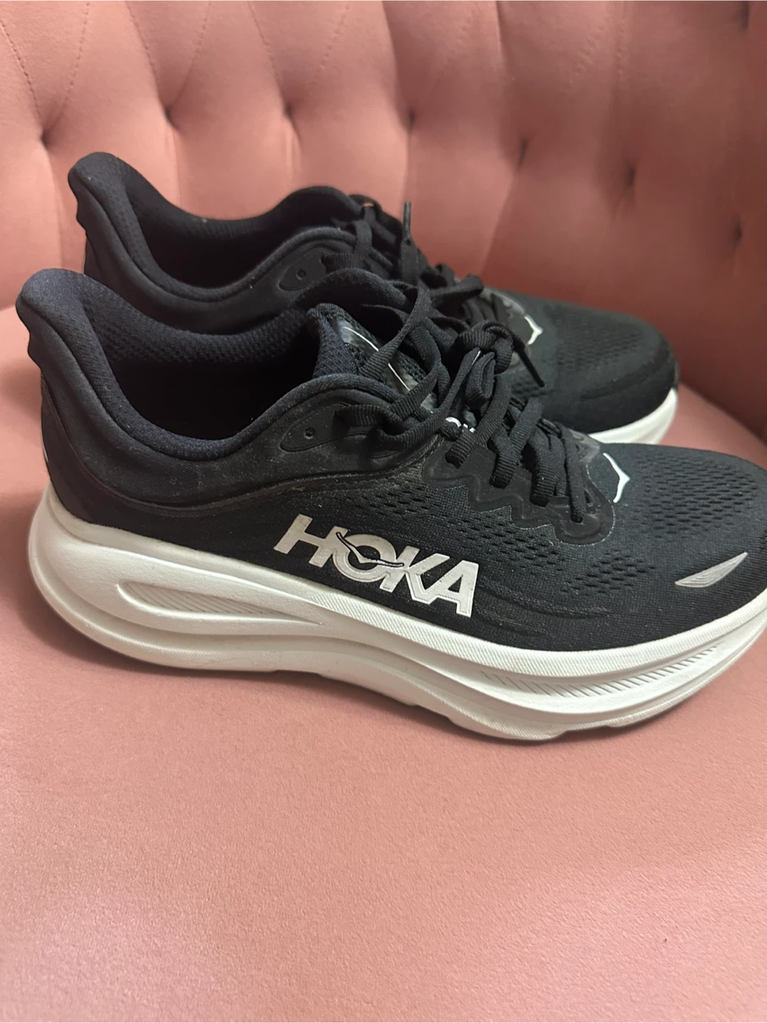 Selling a pair of Hoka Women’s Bondi 9 Wide running shoes in black and white. They're in great shape and ready for someone who loves to run or walk in comfort! Worn a few times