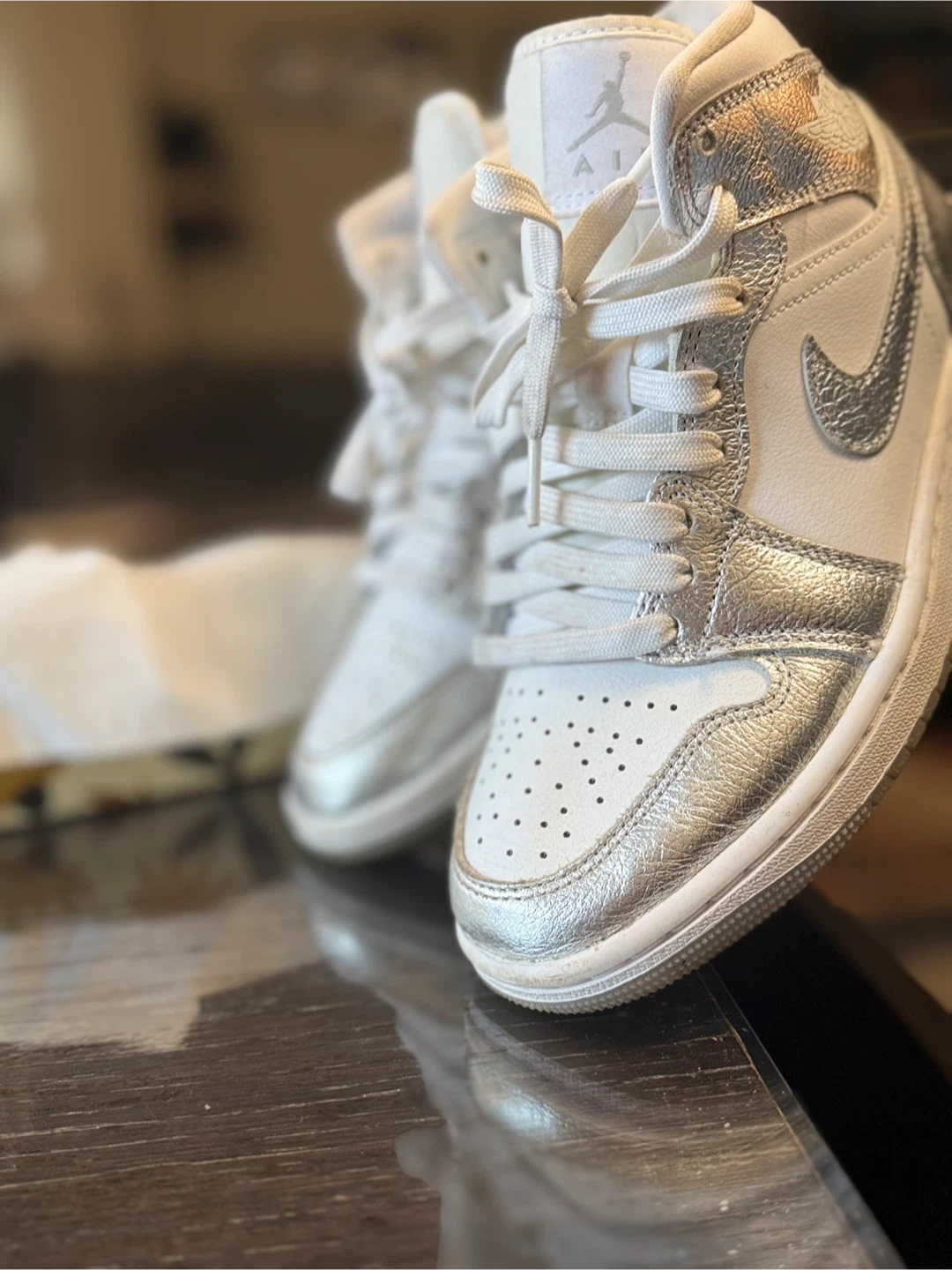 Selling a pair of Air Jordan 1 Mid sneakers in a stylish white and silver colourway. They are in great condition and ready for a new owner! Size is US 6.