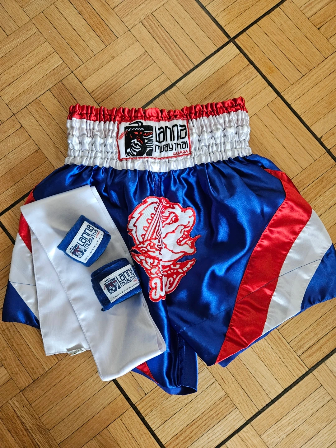 Selling a pair of Lanna Muay Thai boxing shorts in size medium, hand wraps and white belt! They are made in Thailand and in great condition. Perfect for training or sparring!