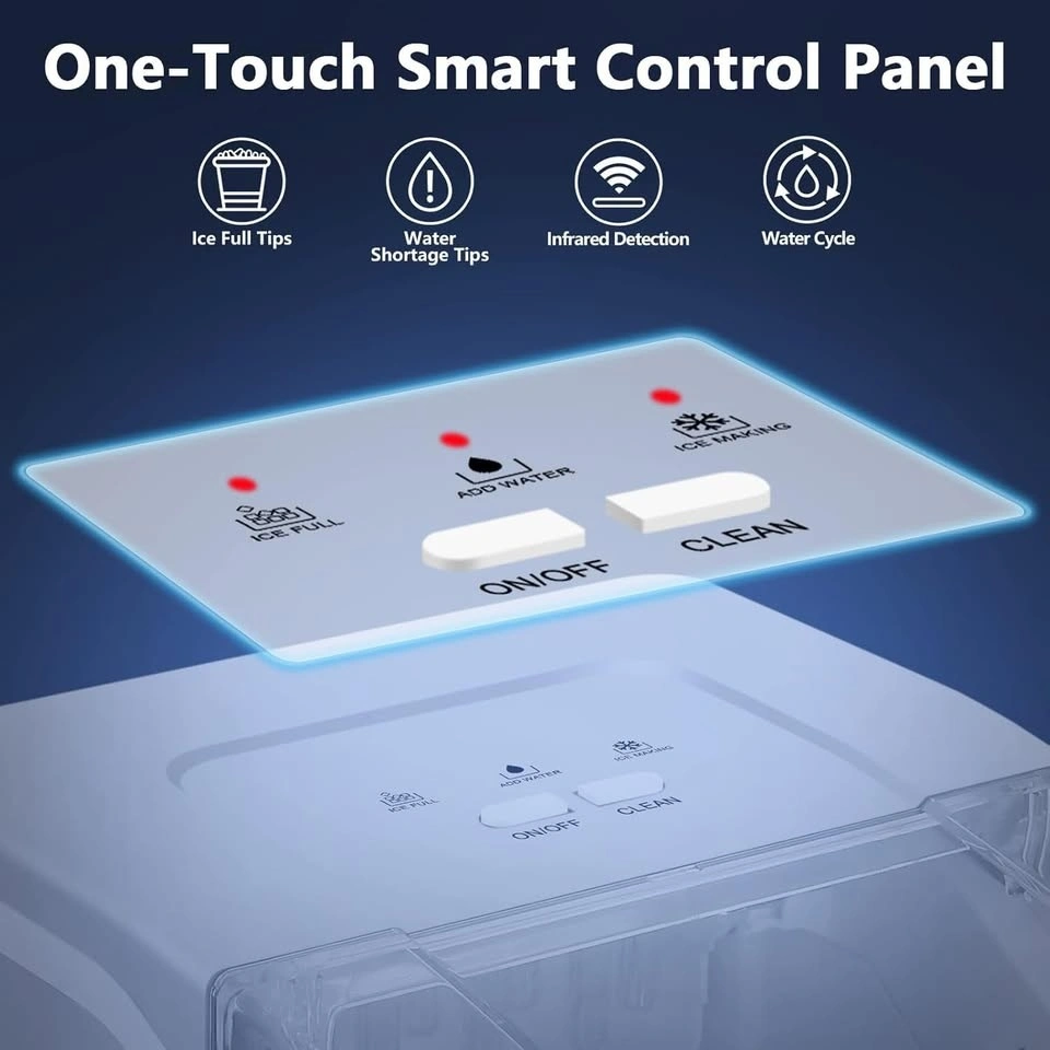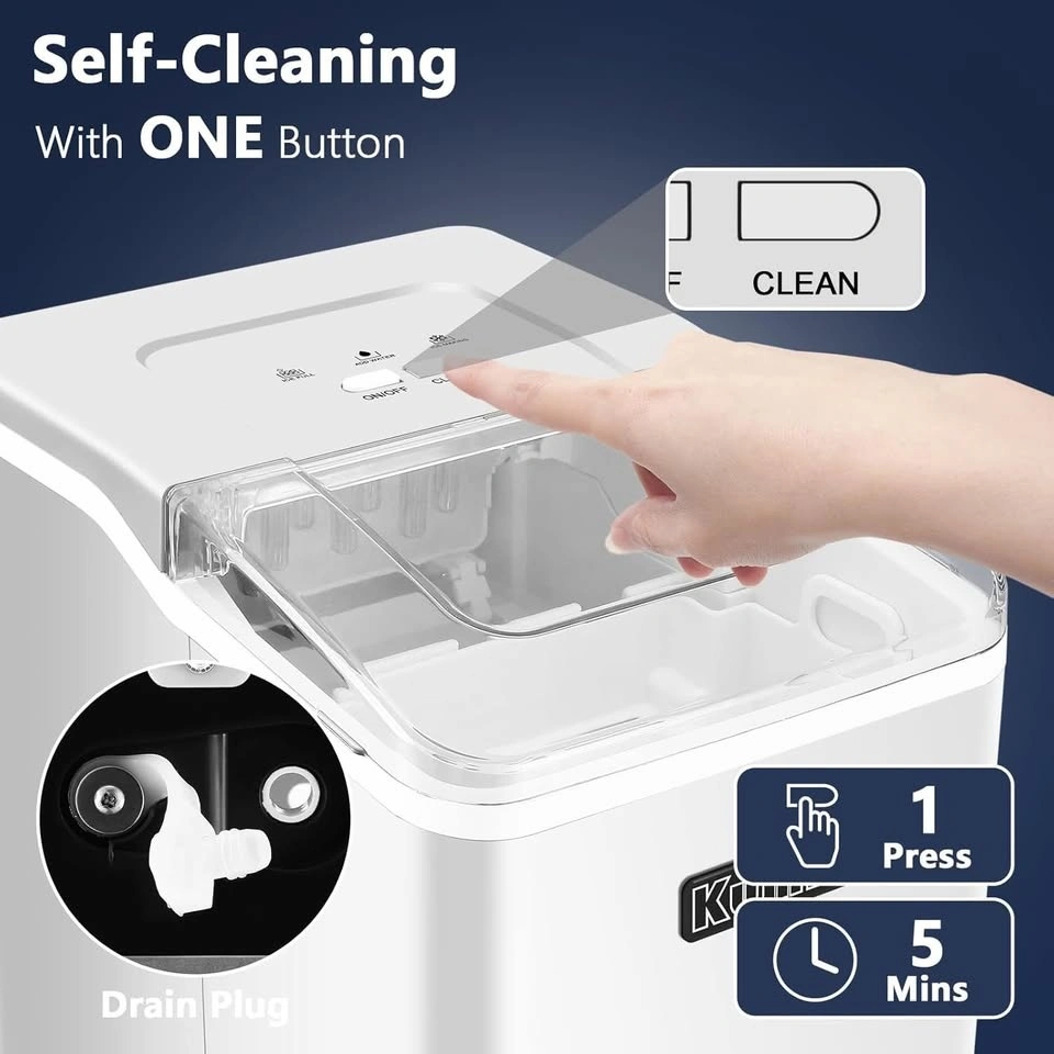 The ice machine is super easy to use with one-click button to start. Intelligent infrared sensor with ADD WATER and ICE FULL Indicators, it will alarm you when lack of water or ice reaches the Max. At the same time, the ice maker machine will auto-stop to prevent damage and overflow. Press the Clean to start self-cleaning, effortless to clean any corner of water tank that you can get healthy and fresh ice whenever. Through the transparent lid, you can monitor the process. Drain plug at the bottom to help remove the unused water.