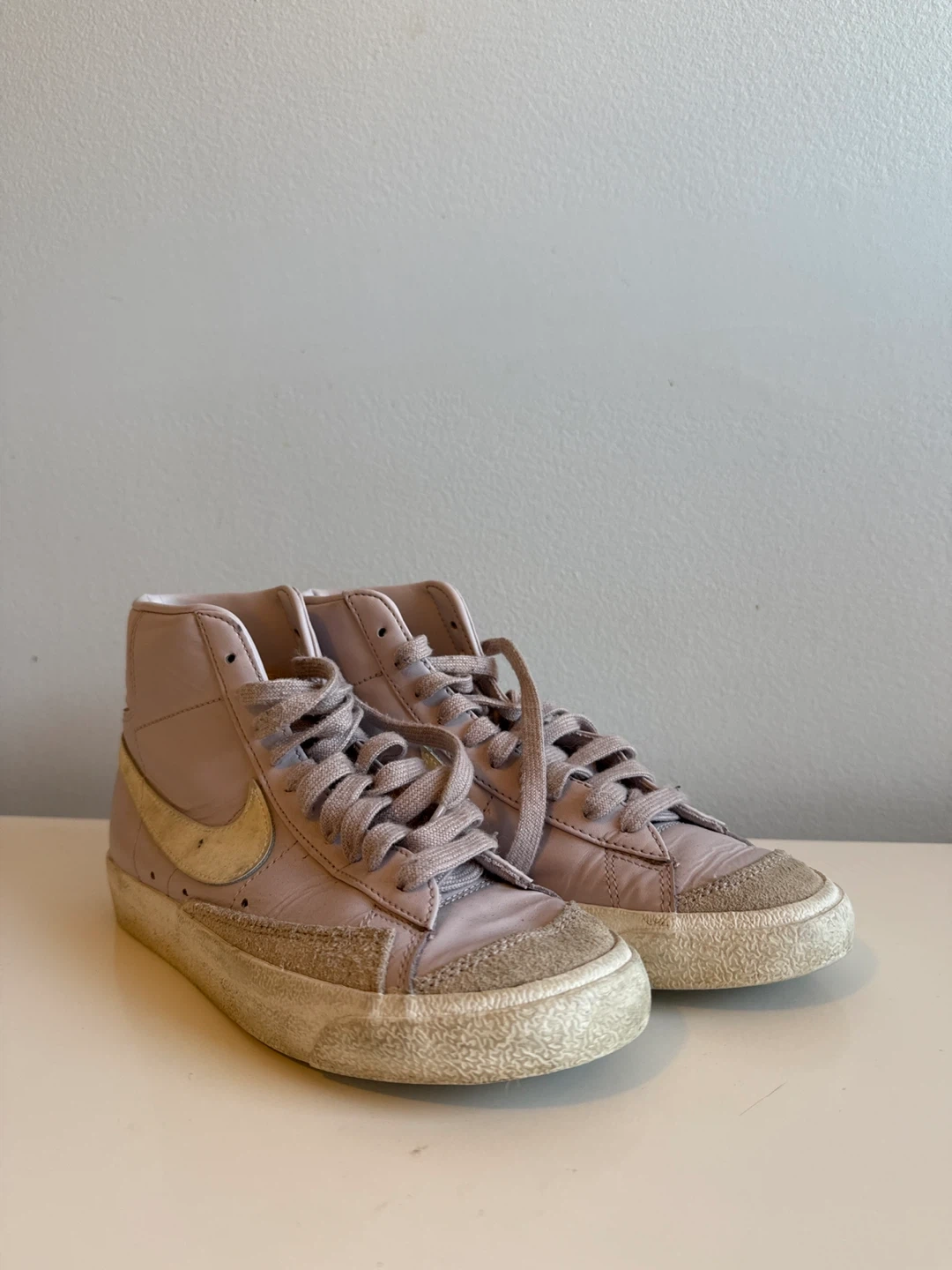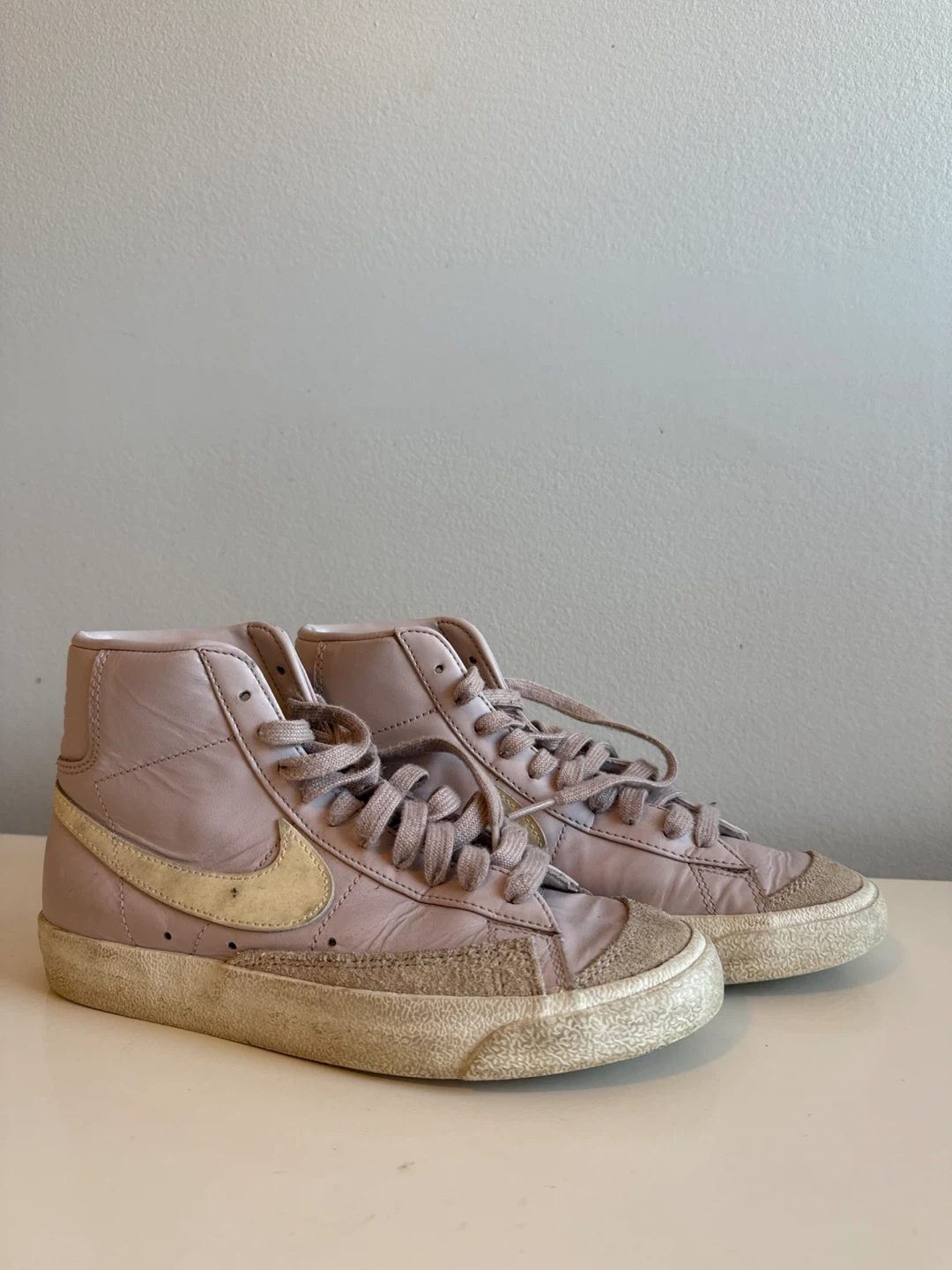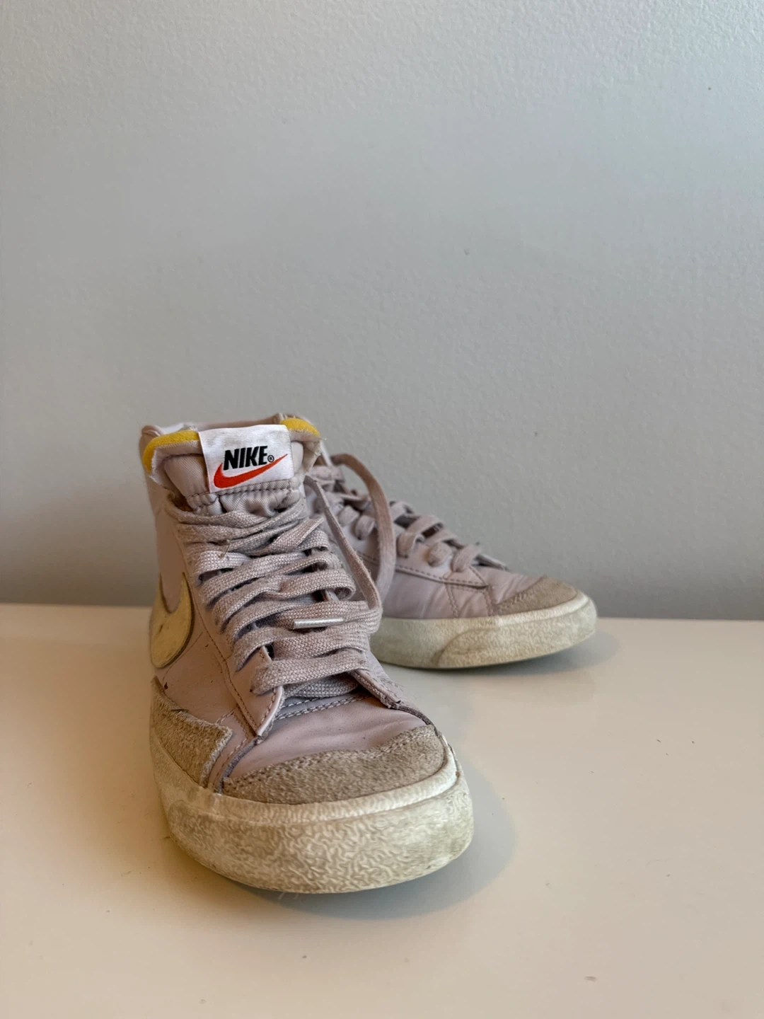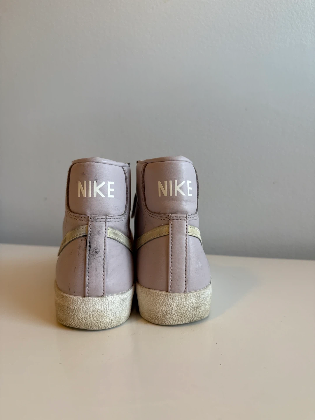 Selling a pair of Nike Blazer Mid '77 sneakers in a lovely lilac colour! These classic high-tops have the iconic swoosh and a vintage-inspired design. They're well-loved and ready for their next adventure!
