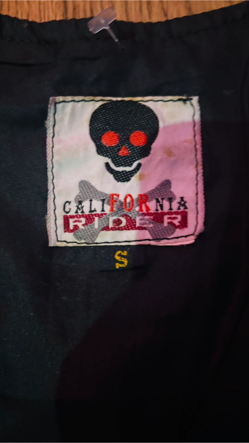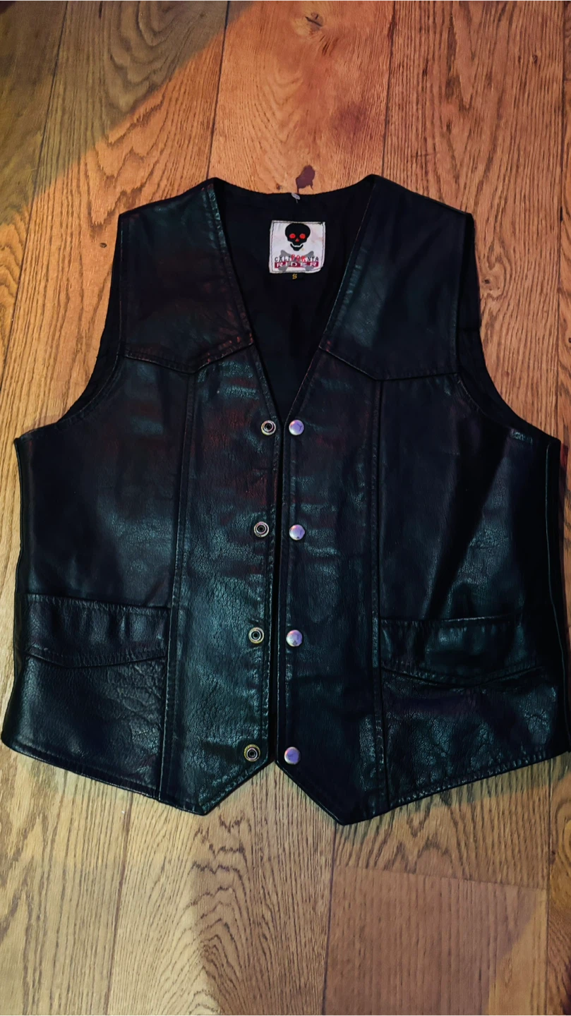 Selling a cool black leather vest from California Rider! It's a size small and has a unique skull and crossbones logo on the tag. Perfect for adding some edge to your outfit!