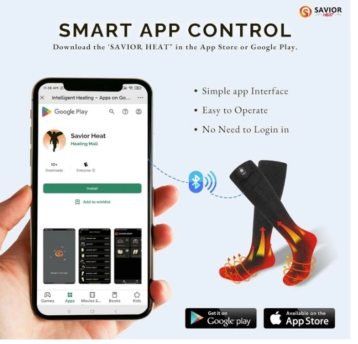 SAVIOR HEAT Heated Socks upgraded it with app control, you can not only adjusted the heat setting with the button, but also can make adjustments without having to remove your shoes or stop what you are doing through the Mobile APP" SAVIOR HEAT". The EH far infrared heating elements are thoughtfully positioned above and below the forefoot and toe area providing all-round warmth for your cold feet.