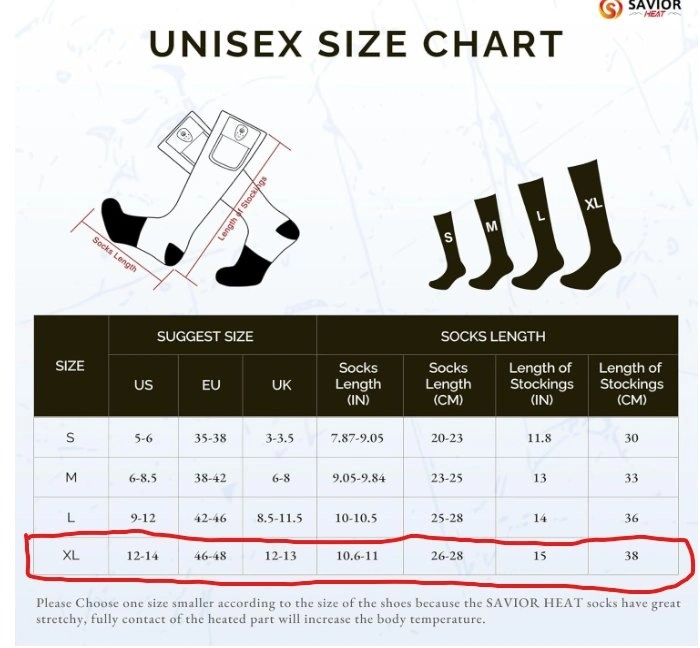 Compared with others' 5v 5000mah batteries heated socks, Savior heat's 7.4V battery heated socks have higher power and current, which makes them 21% warmer and last 20% longer time. The rechargeable heated socks feature 3 heat settings, High 140-150℉, Medium 122-133℉, and Low 104-113℉, they can last about 3-9 hours for a fully charged. Premium Coolmax+Elastic+Spandex material ensures you can feel more comfortable and breathable wearing experience, Please choose the correct size (S, M, L, XL) according to the size chart.