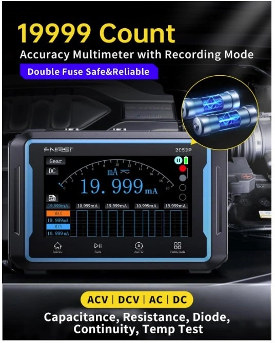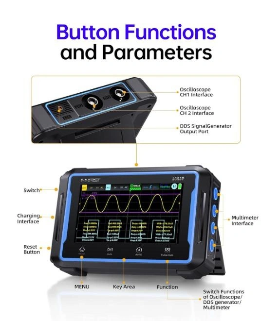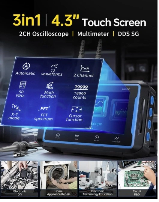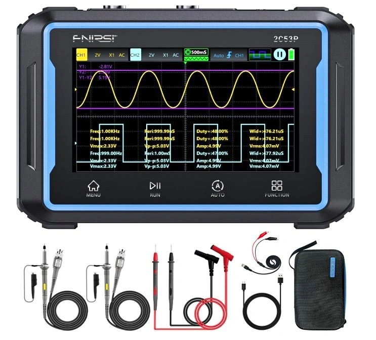 2 channel oscilloscope multimeter: Upgraded from 2C23T, FNIRSI 2C53P handheld oscilloscope has 250 MS/s sampling rate, 50 Mhz bandwidth. Multimeter 19999 counts, 5 measuring values, max and min display. 4.3-inch IPS touch screen, 480*272 high resolution