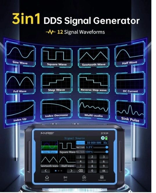 DDS Signal generator: It can output 12 waveforms, the maximum waveform output frequency can reach 10 MHz. FPGA + MCU + ADC hardware structure can ensure a strong waveform capture function. Support waveform preservation, view and export analysis