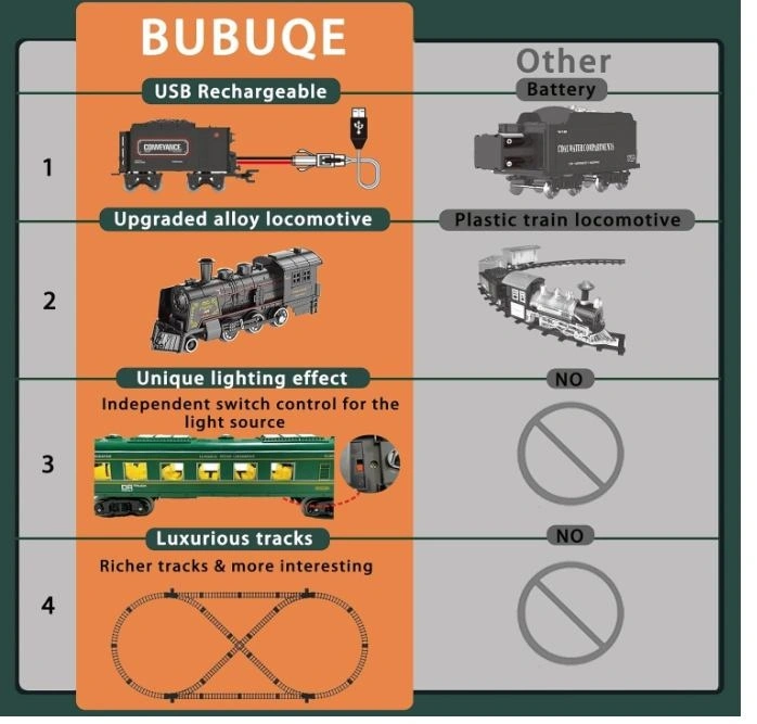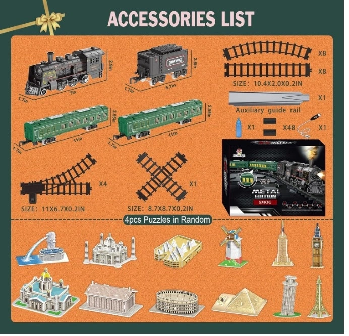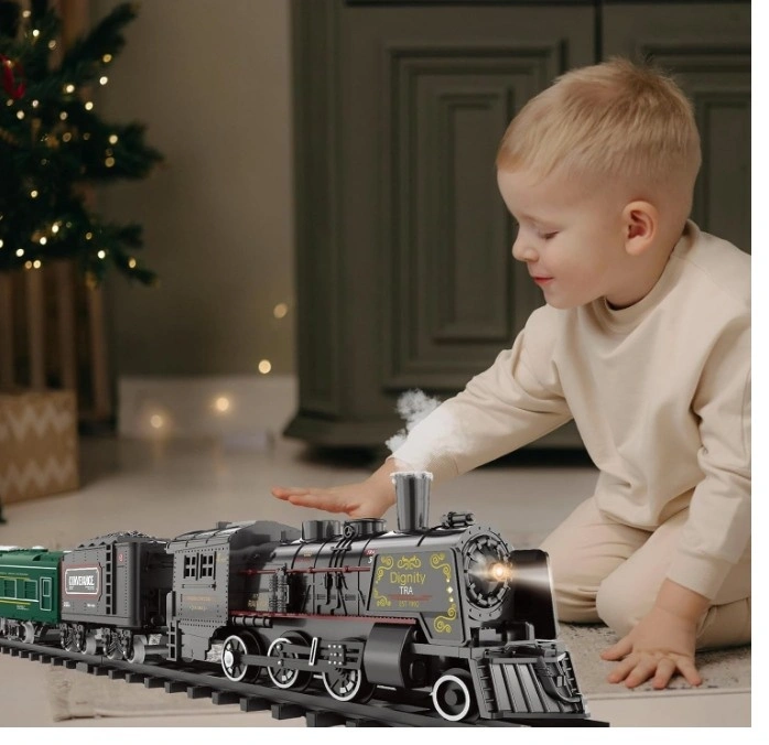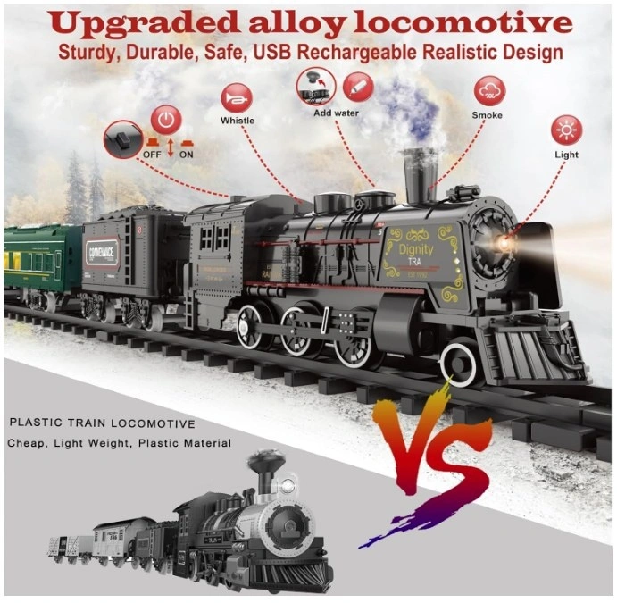 The locomotive steam engine is crafted from premium alloy materials, while the other parts are made of sturdy ABS plastic. This combination makes the train set more durable, impact-resistant, and stable on the tracks, reducing the risk of derailment—unlike flimsy, all-plastic, battery-powered trains. Certified to meet U.S. toy safety standards, this train set ensures a secure and enjoyable playtime for kids and families alike.