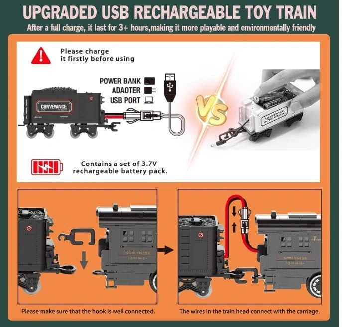 This train set features 1 all-alloy locomotive steam engine, 1 coal carriage, and 2 passenger carriages with lights, 8 curved tracks, 8 straight tracks,4 y-shape tracks,1 cross track . Our train toys come with a 1000mah/3.7v rechargeable lithium battery and USB charging cable. When full of charging, the full -equipped toy train is driven around the Cristmas tree. Your child can enjoy a few hours of happy travel. A fully charged battery (in about 210 minutes) will last for approximately 210 minutes of usage.