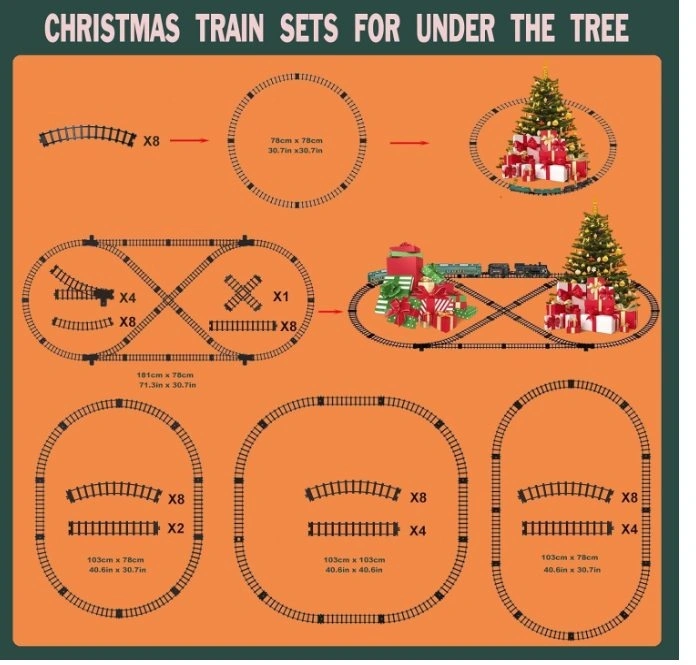 The modular rail track parts can be assembled into your own railroad shape and layout, making it suitable for most family Christmas trees and any table during the festival. The auxiliary slide rail helps place the train on the track smoothly, and once you turn on the switch, the kids' train set will move steadily on the toy track. The 97.2'' (L) x 41.7'' (W) long oval layout of the track provides a pleasant journey.. Track width: 5cm/1.96in.