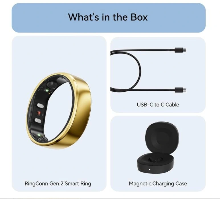 What You Get: RingConn Gen 2 Smart Ring*1, Charging Case*1, 1m/3.3ft USB-C to USB-C cable*1, user manual*1, and friendly customer service
