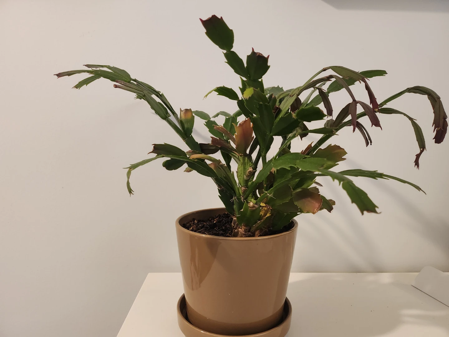 Selling a healthy Christmas cactus in a brown pot! It's a beautiful addition to any home and adds a touch of greenery