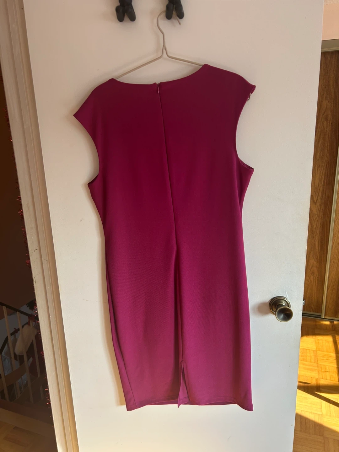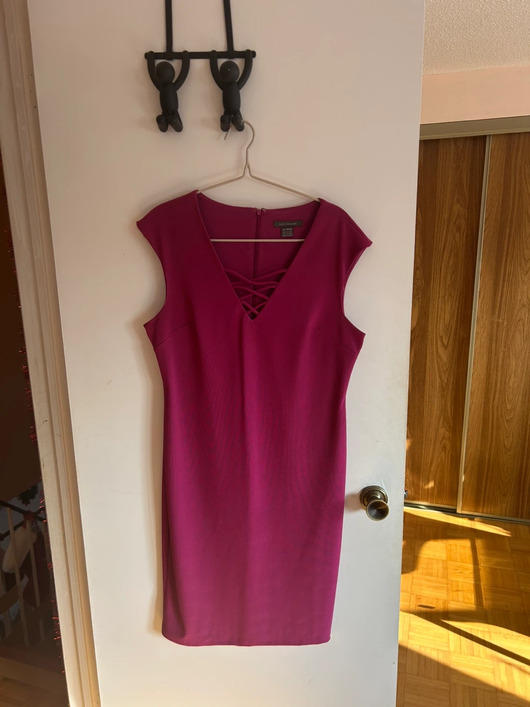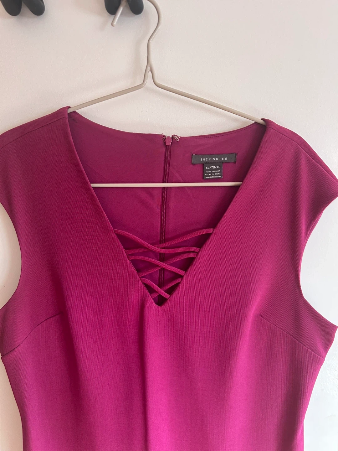 Selling a gently used Suzy Shier dress in a beautiful magenta colour. It's a size XL. Perfect for a night out or a special occasion! Straight cut, stretchy and comfortable fabric, with criss-cross details at the neckline.