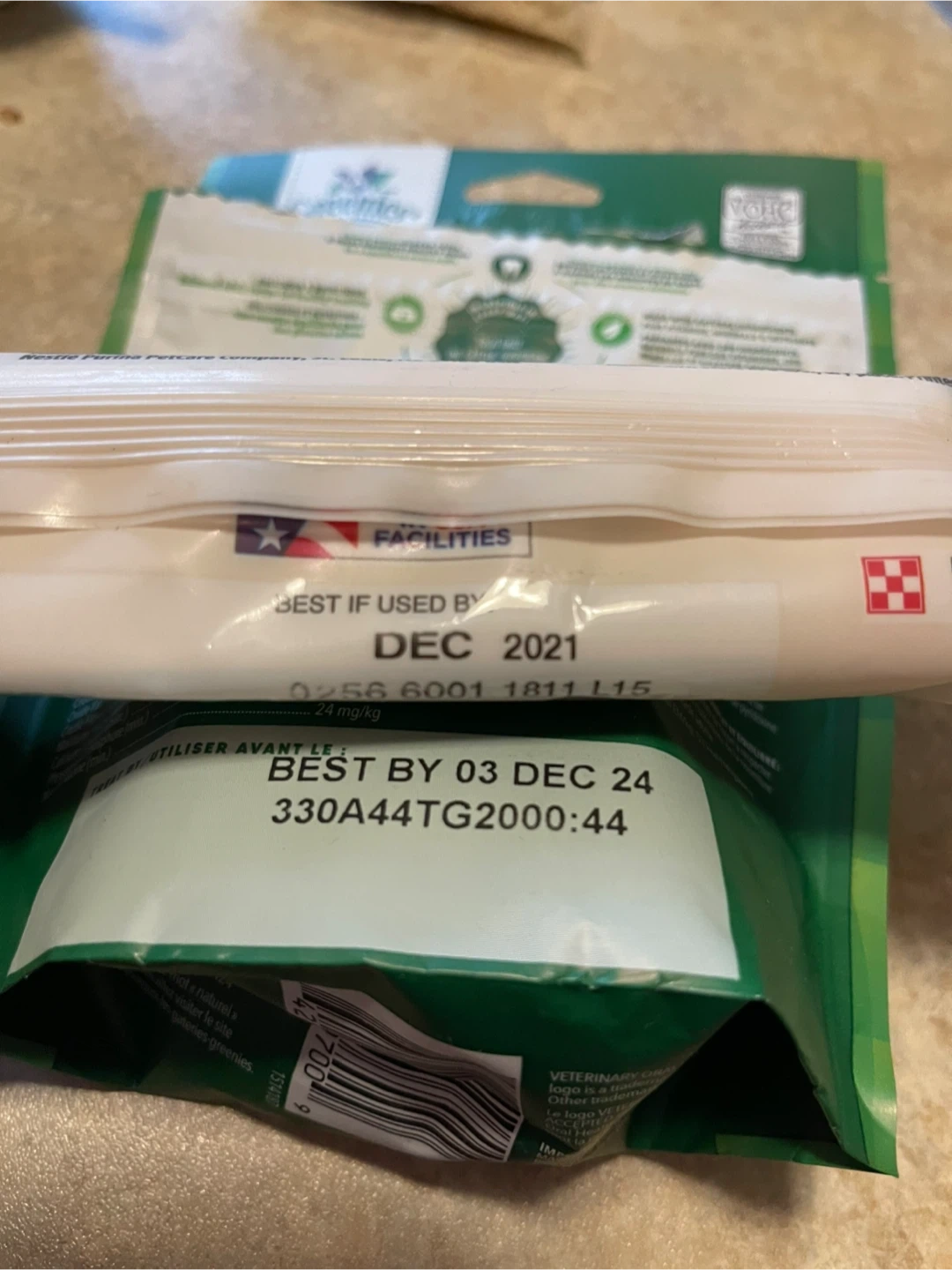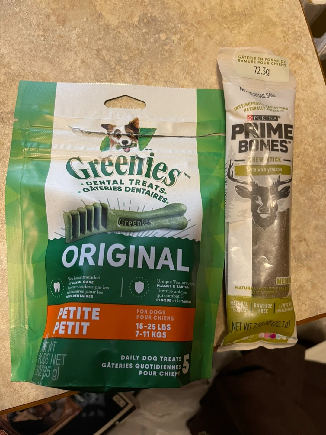 Selling Greenies dental treats for dogs, petite size for dogs 15-25 lbs (7-11 kgs) and Purina Prime Bones chew stick, with wild venison flavour. Best before dates are December 2024 and December 2021