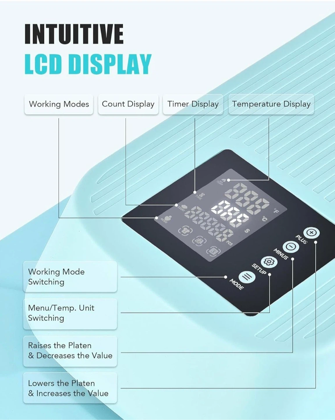 It also has an intuitive LCD display with working modes, count display, timer display, and temperature display