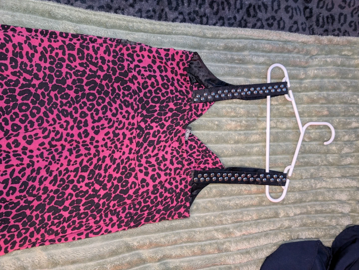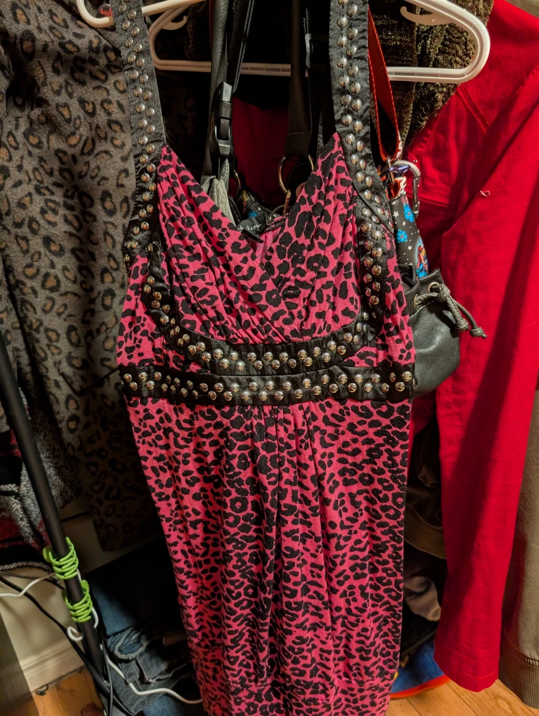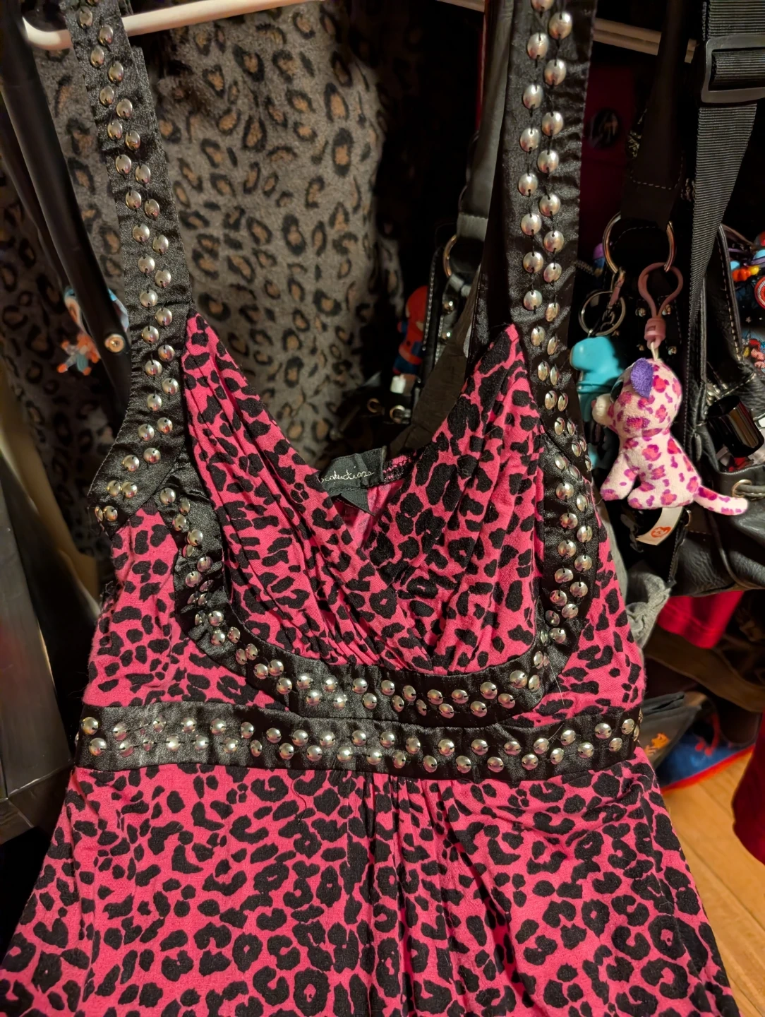 Cute pink dress with a fun leopard print! It has studded detailing around the neckline and waist. Size Large is listed on the tag, though I'm a medium and it fits me just fine! Stretchy soft material.