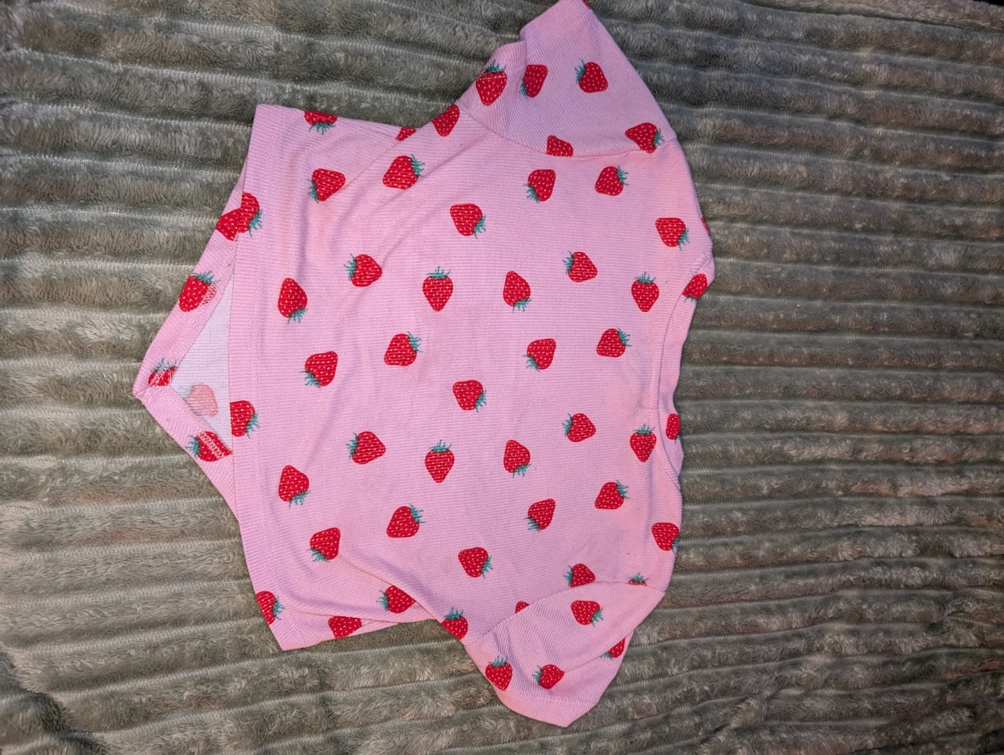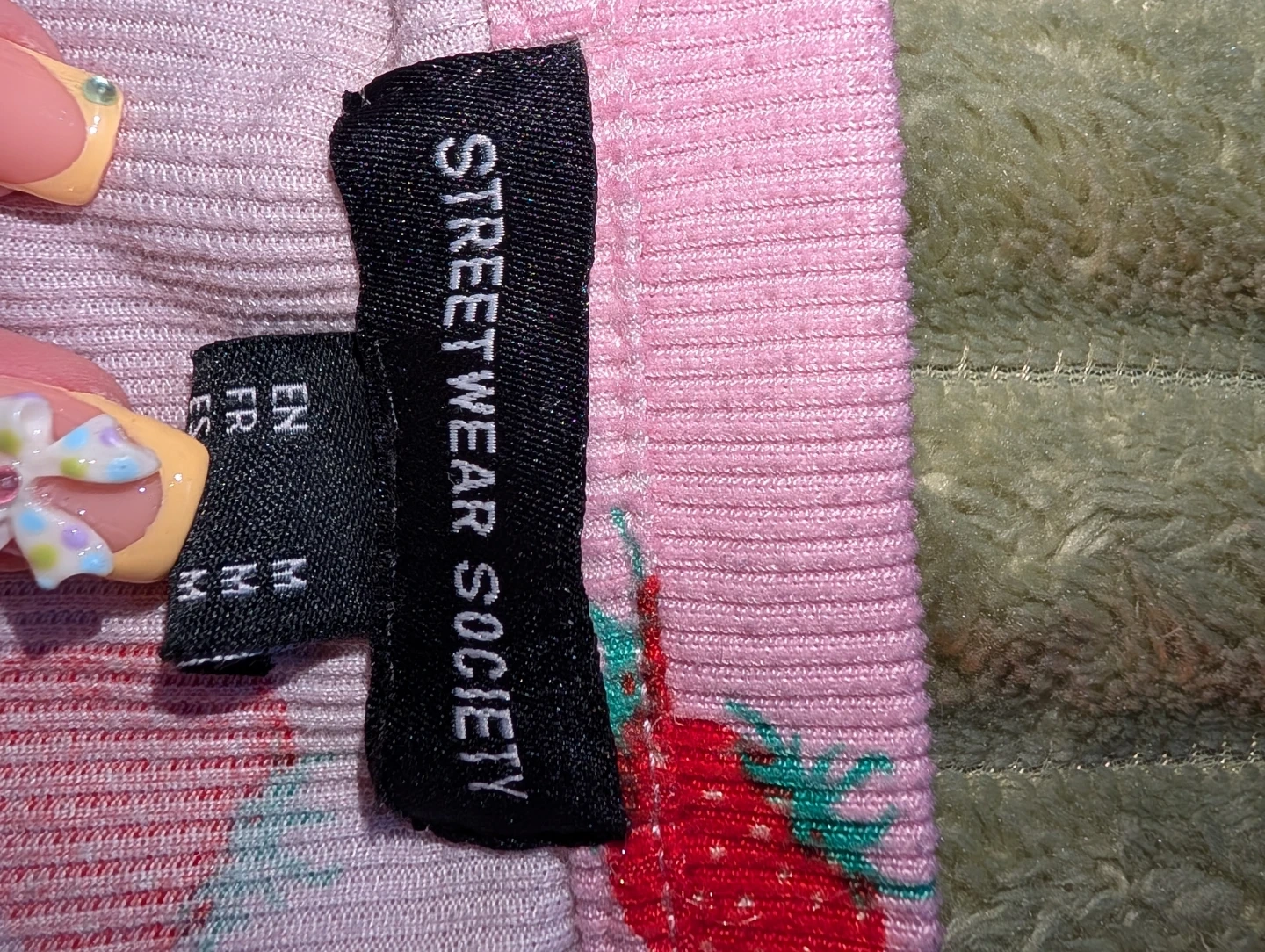 Cute pink croptop with a strawberry print from Streetwear Society! Size medium, form fitting with dynamic shape! Soft ribbed fabric.