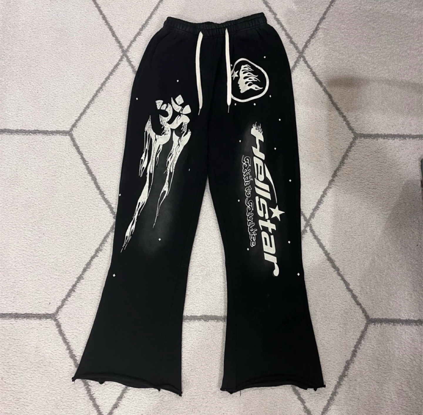 Selling a pair of black Hellstar sweatpants. They feature unique white graphic designs on the legs. The pants have a drawstring waist and a flared leg opening. Perfect for casual wear!