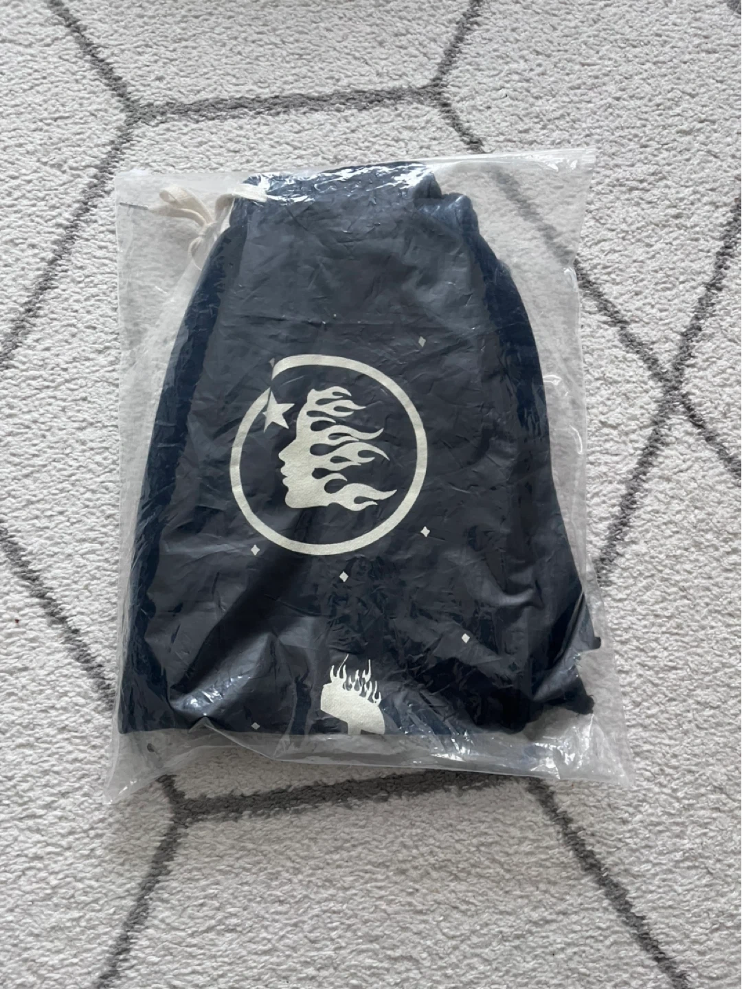 Selling a pair of black Hellstar sweatpants. They feature unique white graphic designs on the legs. The pants have a drawstring waist and a flared leg opening. Perfect for casual wear!