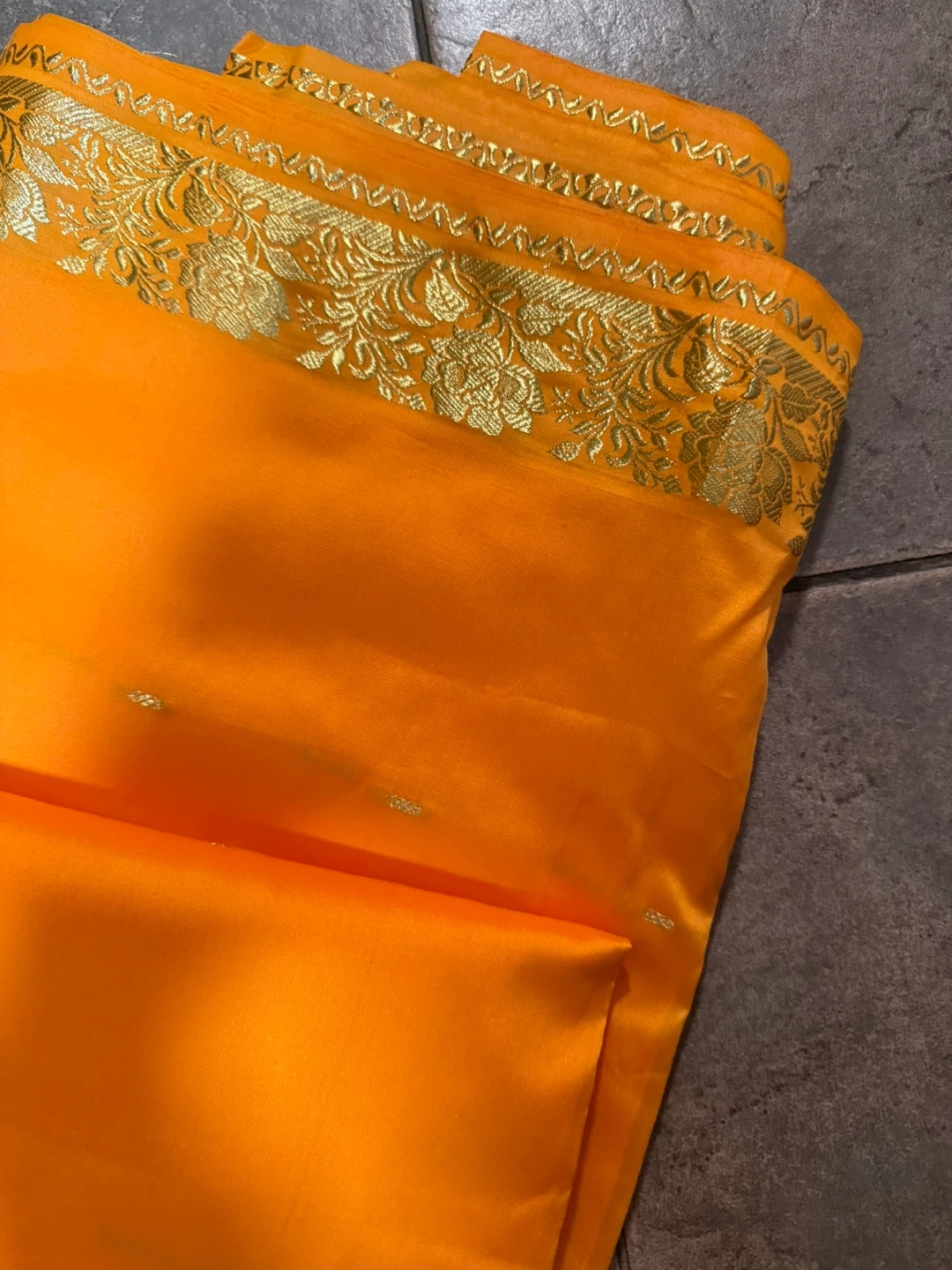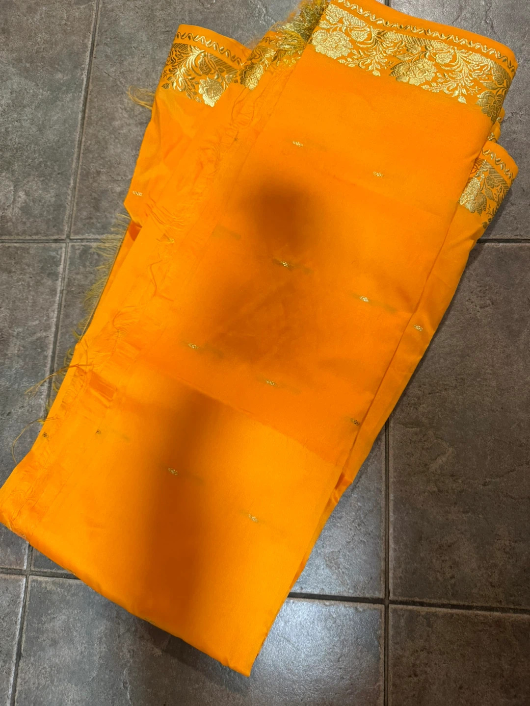 Beautiful orange saree with a delicate gold border design, perfect for adding a touch of elegance to any occasion. The fabric feels smooth and comfortable, making it ideal for all-day wear. It's in great condition and ready for a new home! (Bought and used just to decorate the wall ) (not worn - barely used for 2 hours )