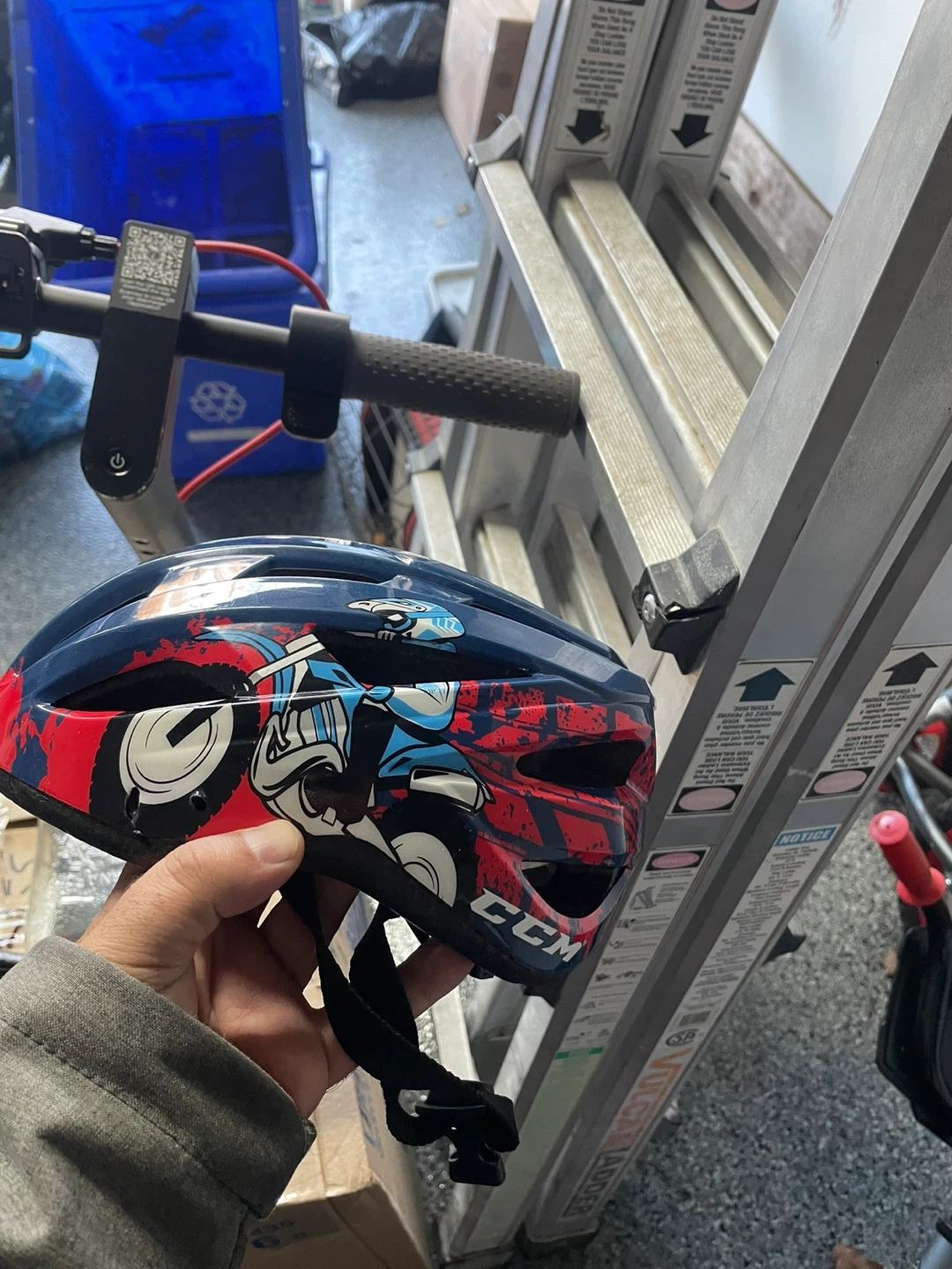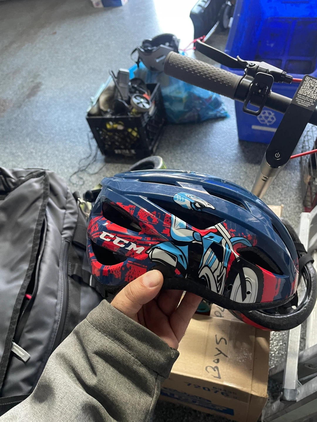 Selling a couple of kids' bike helmets. One is blue with a motorcycle design, and the other is green with a geometric pattern. Perfect for keeping your little ones safe while they ride! $10 each or all 3 for $25