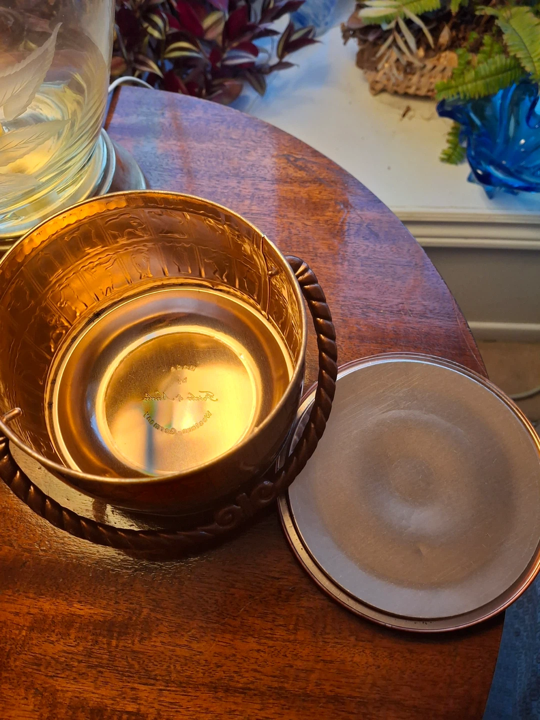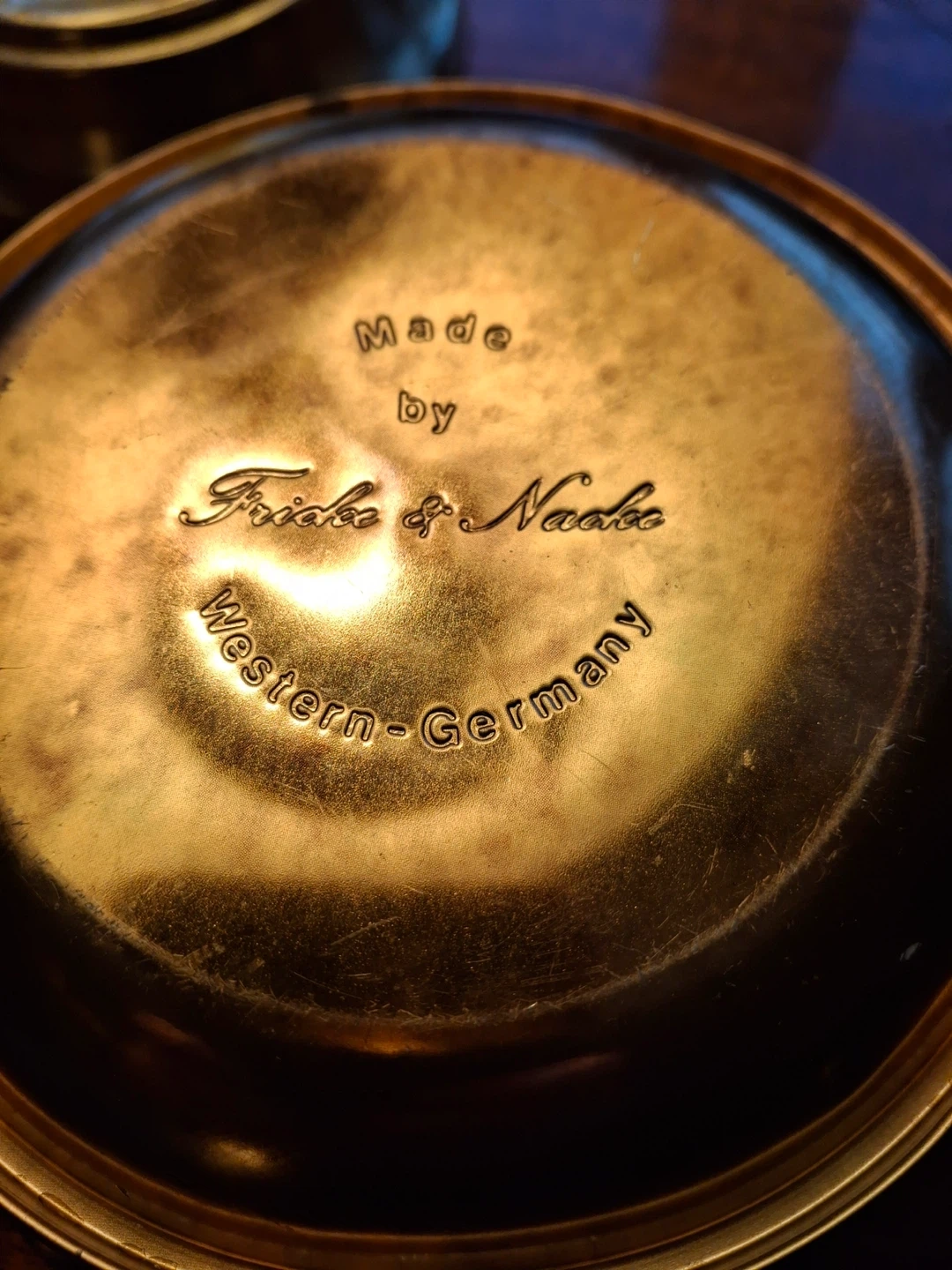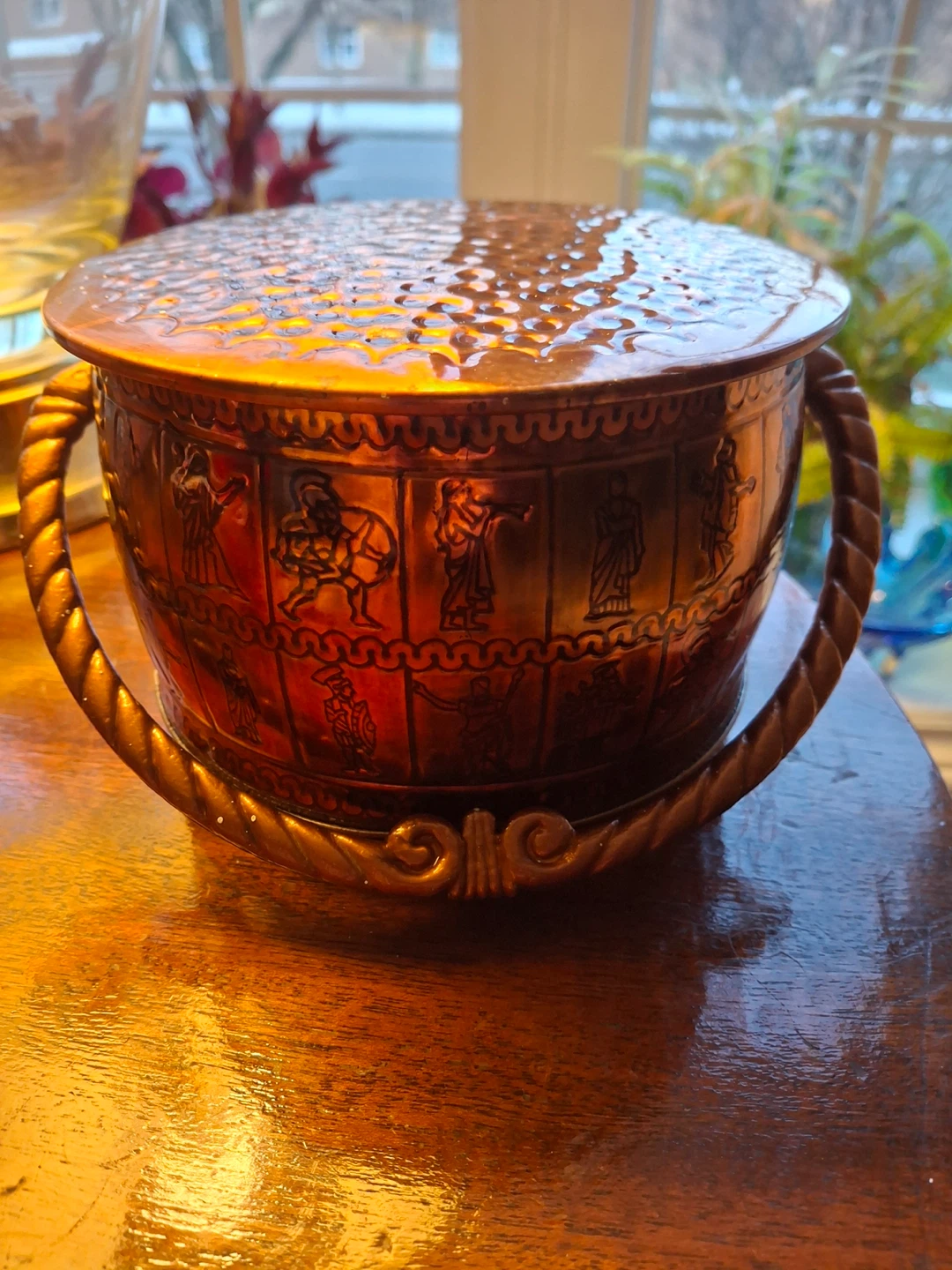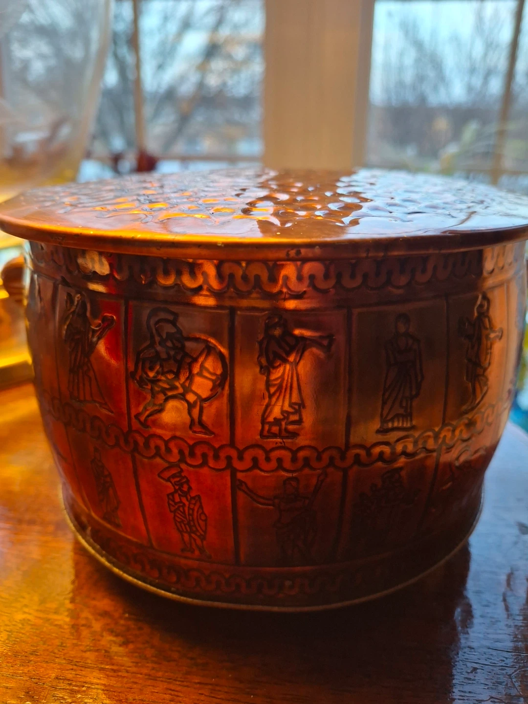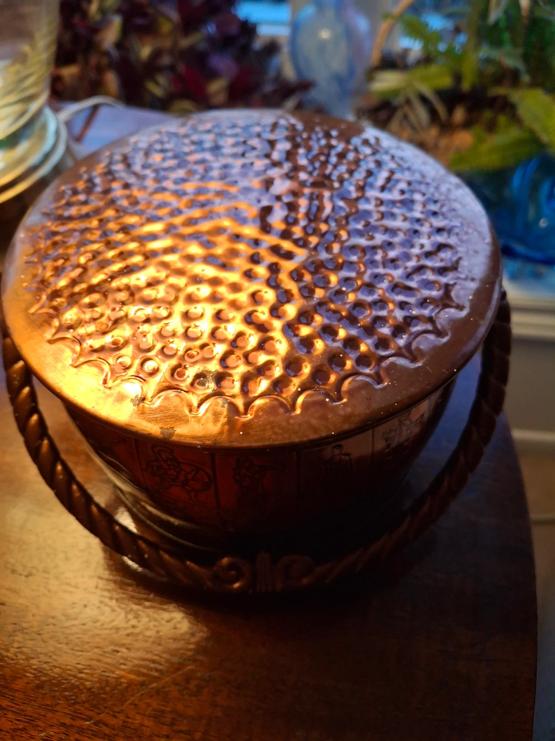 Copper tin with lid and plastic handle. Fricke & Nacke, made in west Germany. Distressed look, with a few dents and some discolouration (adds character!) 6” across and 3.5” high.