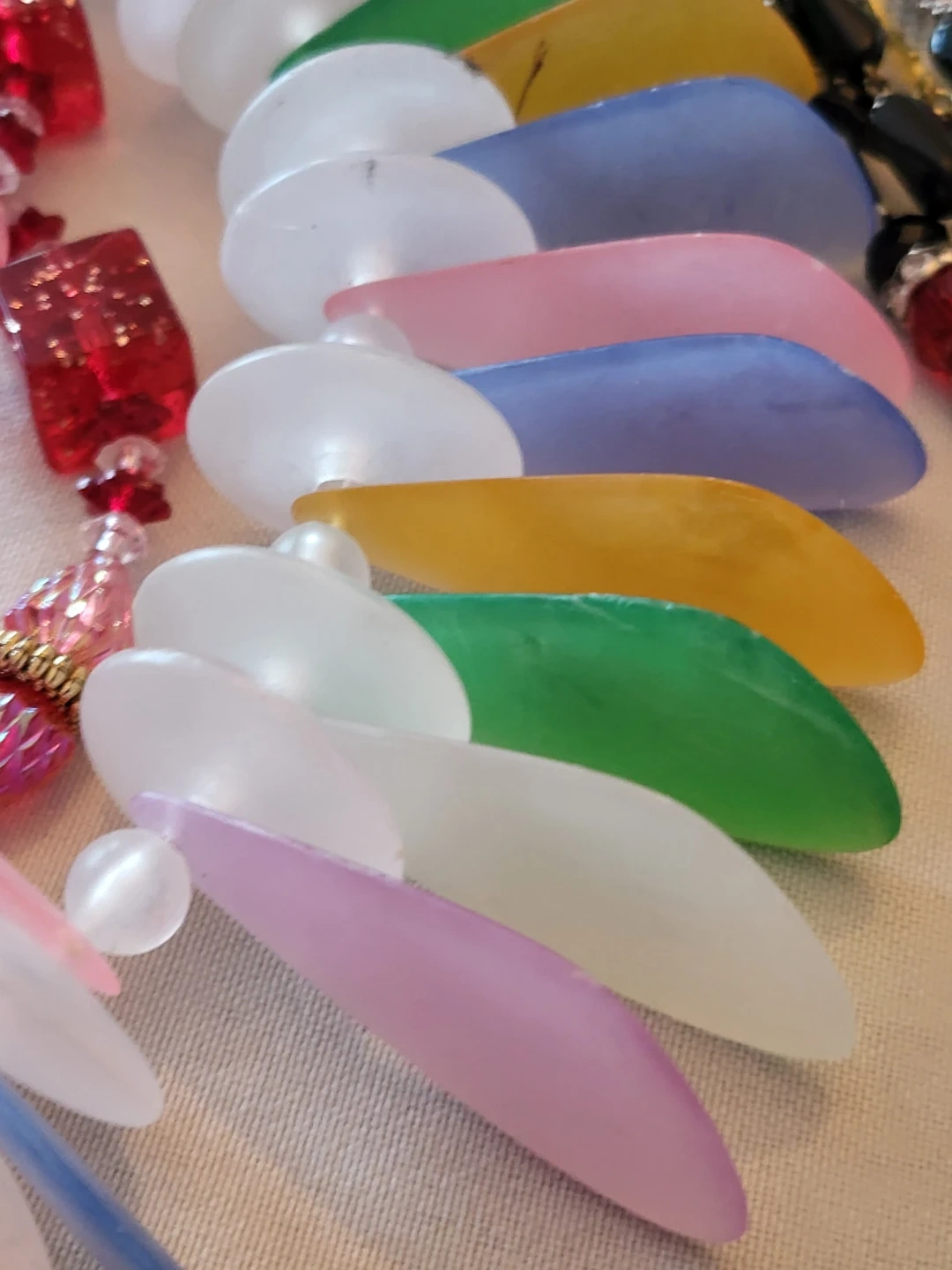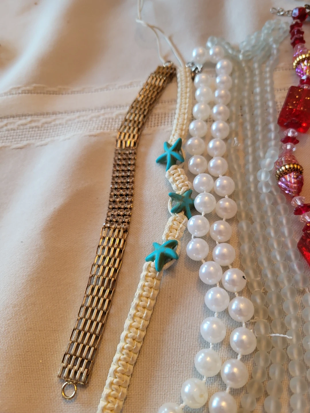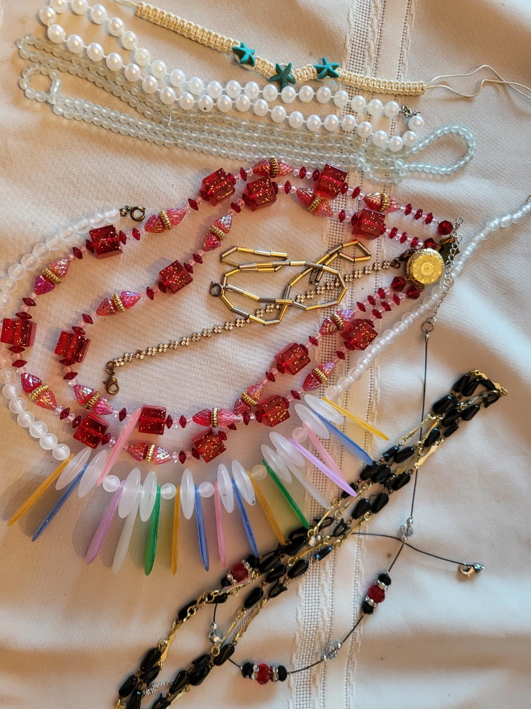 Selling a collection of assorted costume jewellery necklaces. There's a variety of styles, including beaded necklaces with pearls, colourful accents, and unique designs. Perfect for adding some sparkle to your outfits!