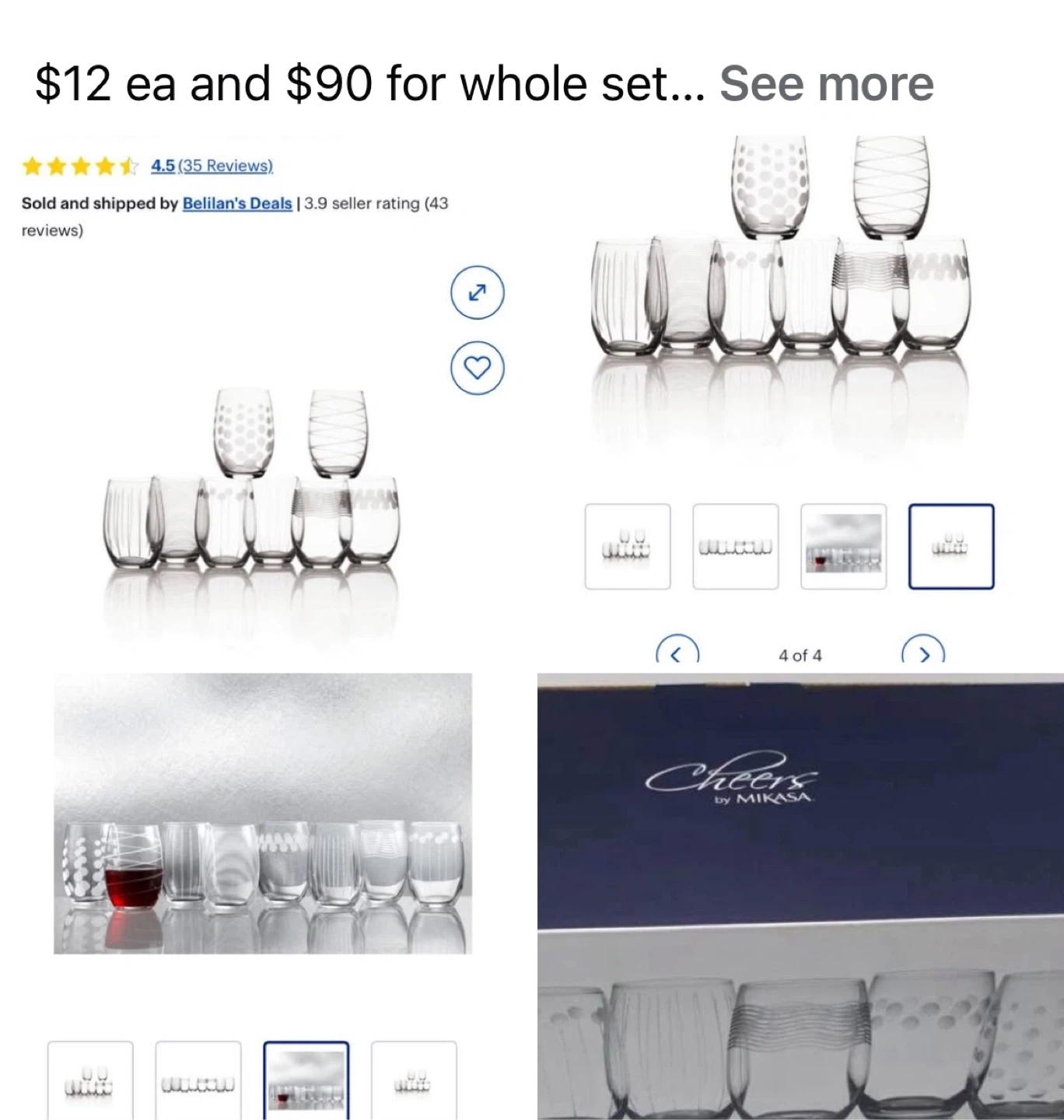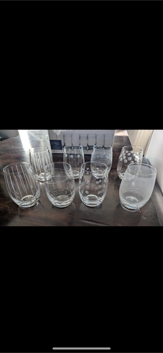Selling a set of new Mikasa Cheers drinkware. There are 8 glasses in total, each with a unique etched design. Perfect for everyday use or entertaining!