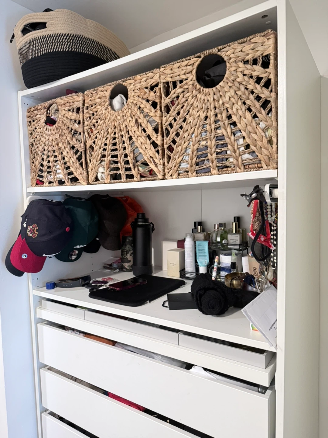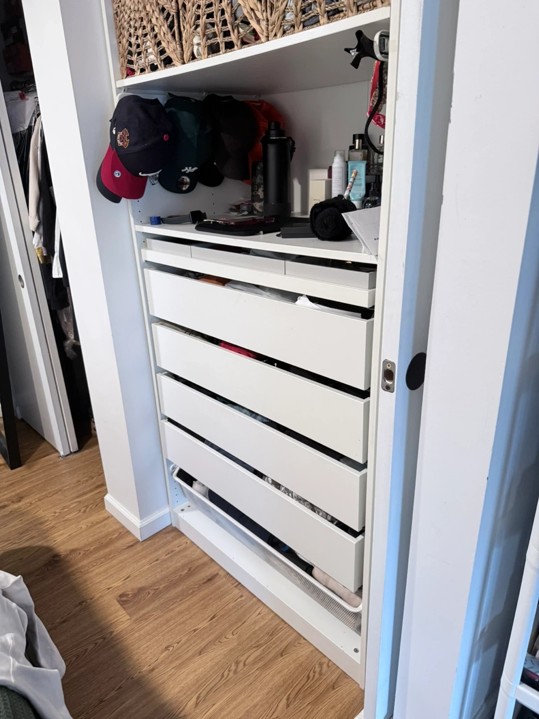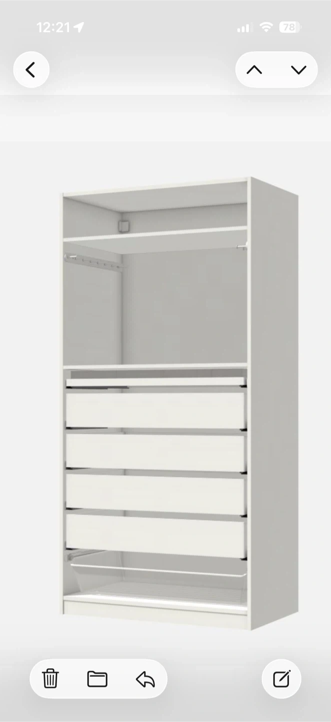 Selling an IKEA PAX wardrobe frame in white. It has several drawers and shelves for great storage. The frame is in good condition and ready to be used!