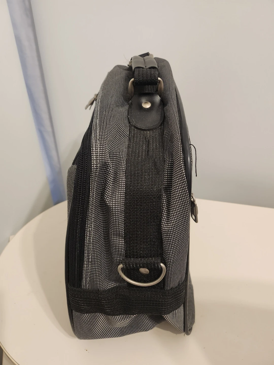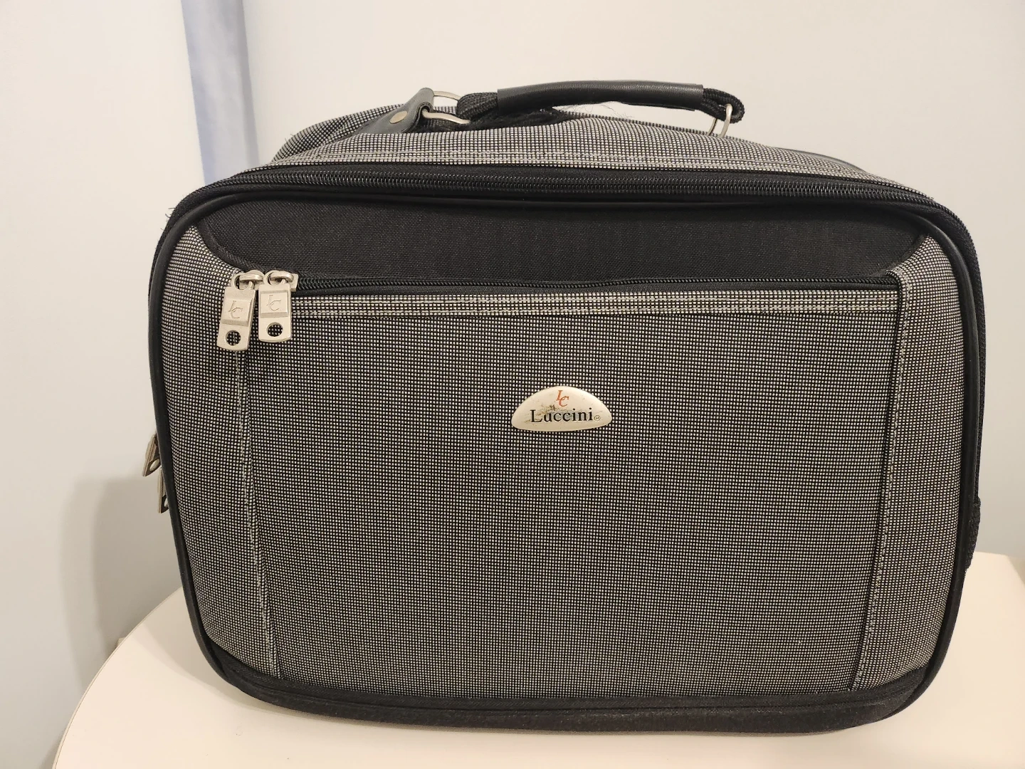Here's a handy Laceini carry-on bag in black and grey! It's in great shape and ready for your next trip. Perfect for keeping your essentials organized while you travel. It has a top handle and a zippered front pocket.