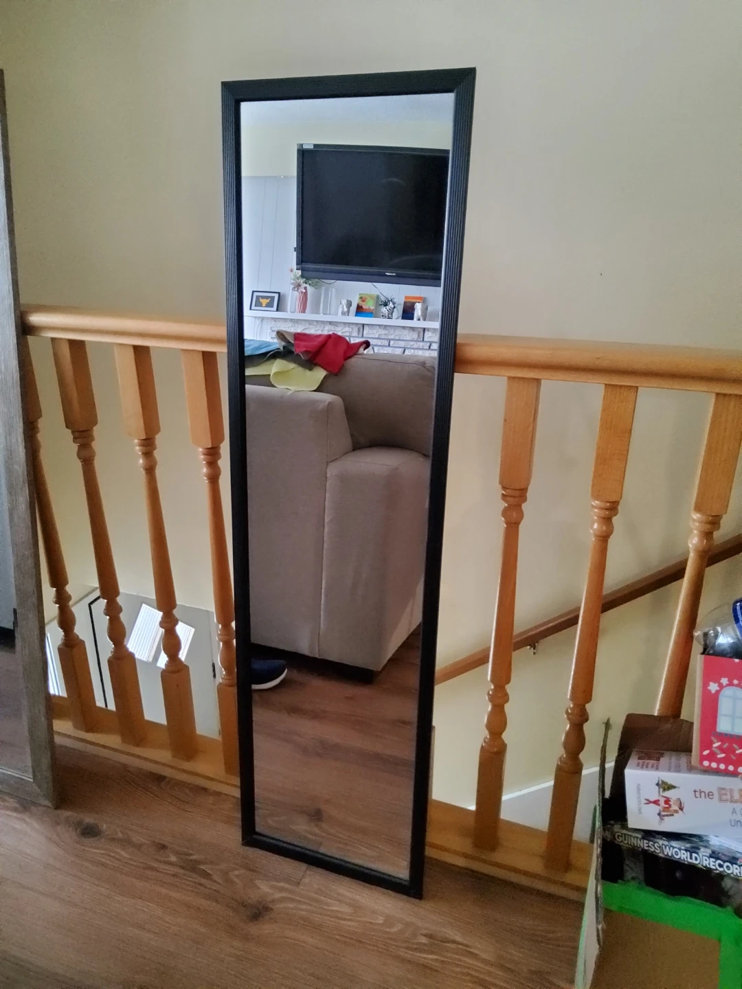 Selling a full-length mirror with a sleek black frame! It's in great condition and ready to brighten up any room. Perfect for checking your outfit or adding depth to your space