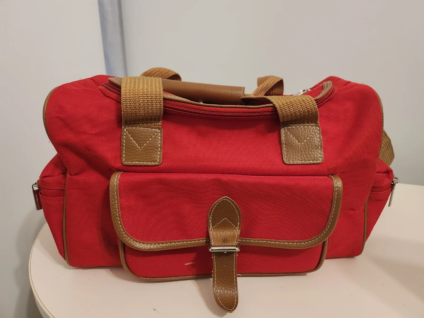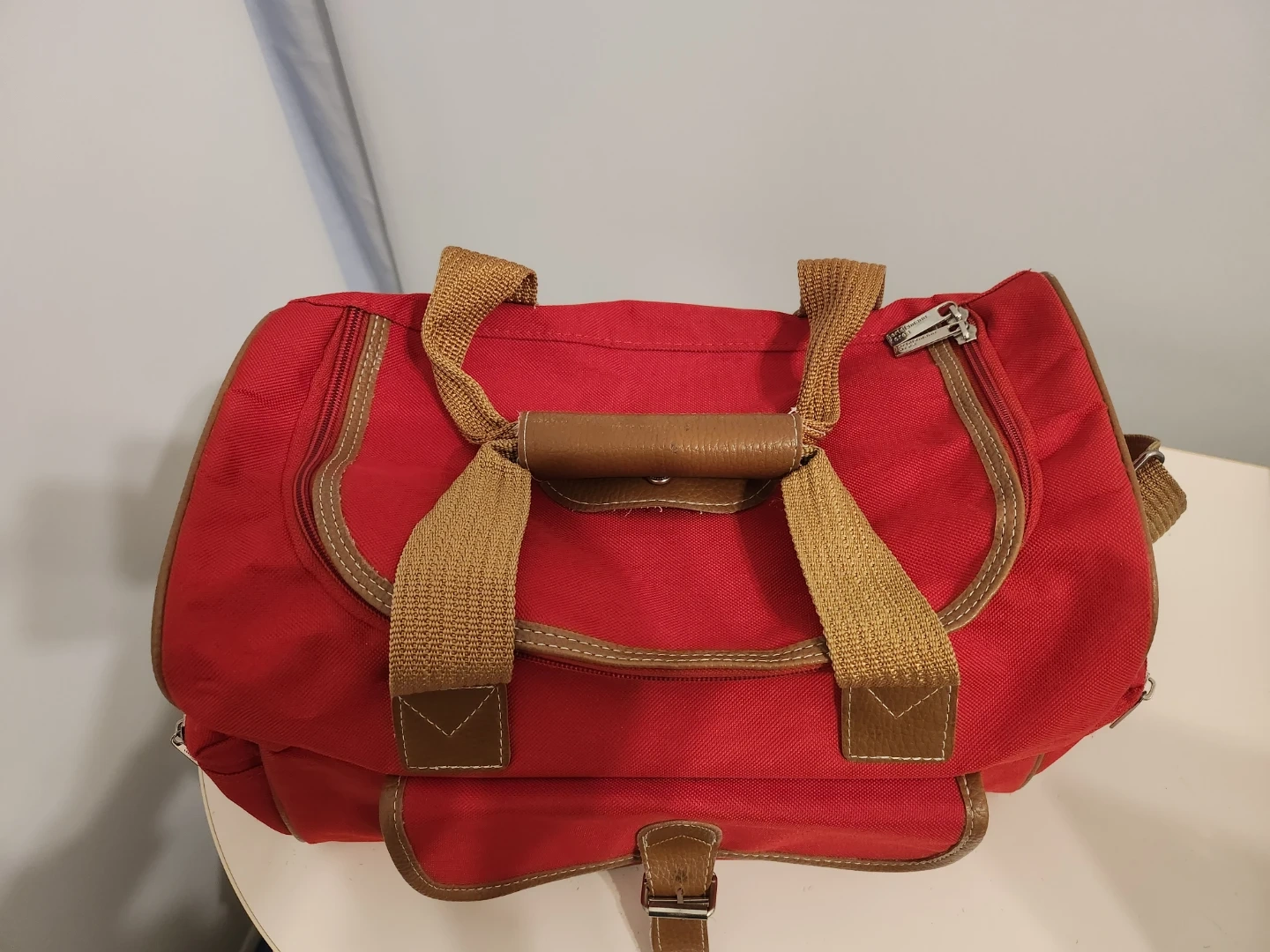 A great red duffel bag for travel or the gym! It has brown accents and sturdy handles. Perfect for carrying your essentials in style