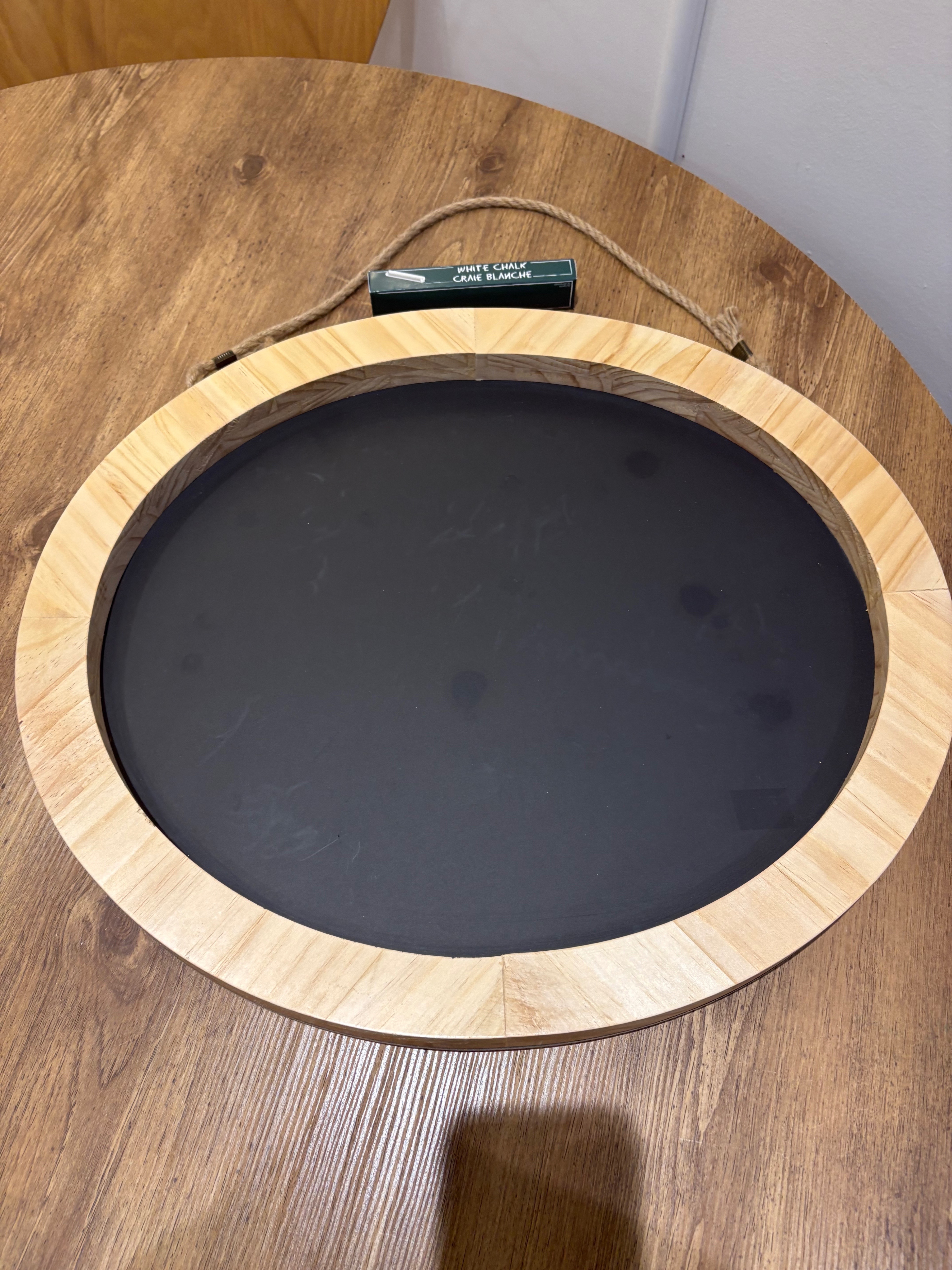 Stylish round hanging chalkboard with natural wood frame and rope hanger.