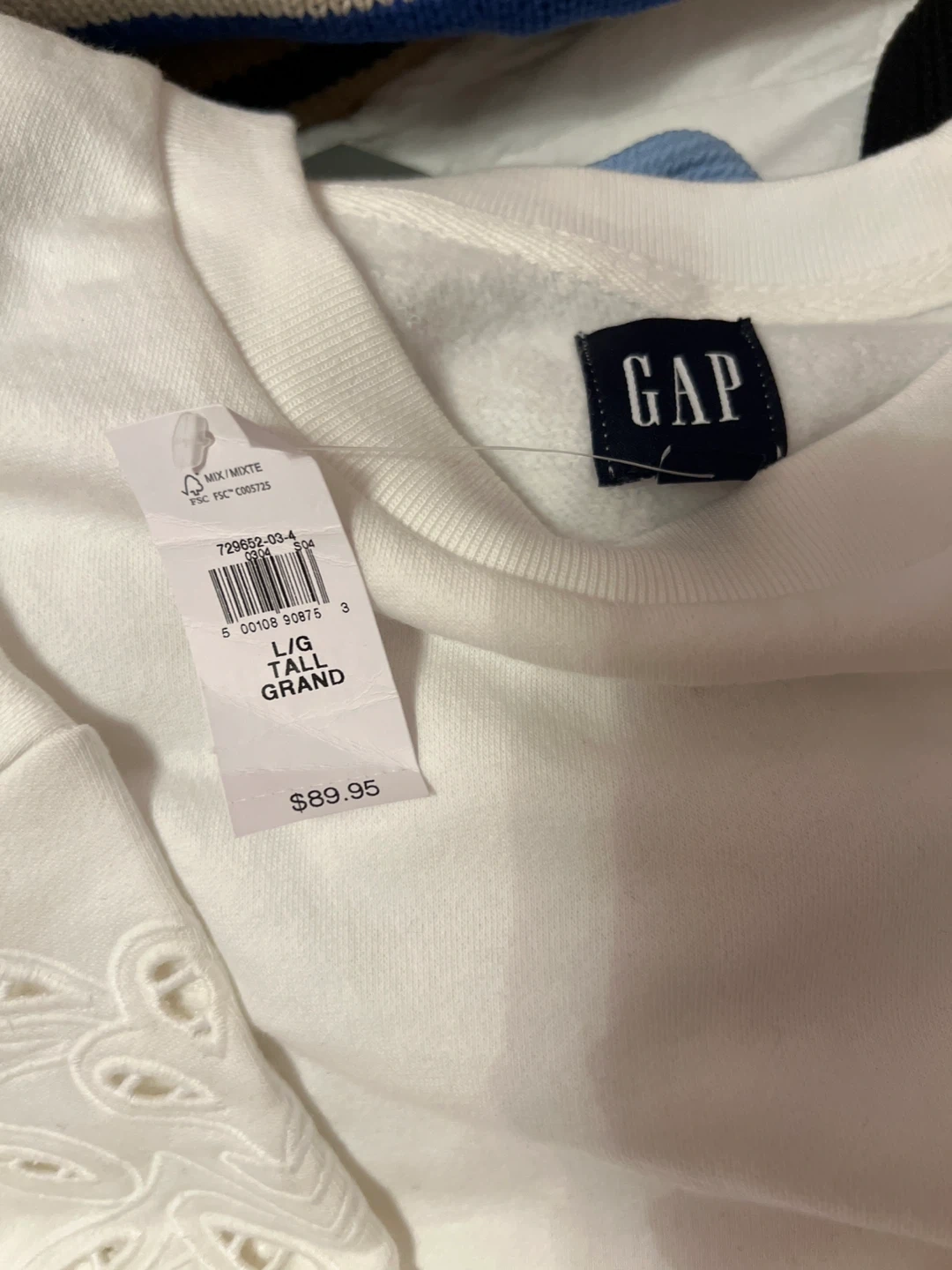 This is a brand new Gap Tall Grand sweatshirt in size L! It's a lovely white colour and features a nice design on the sleeves. The tag shows it originally retailed for $89.95!