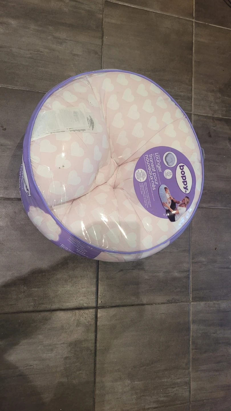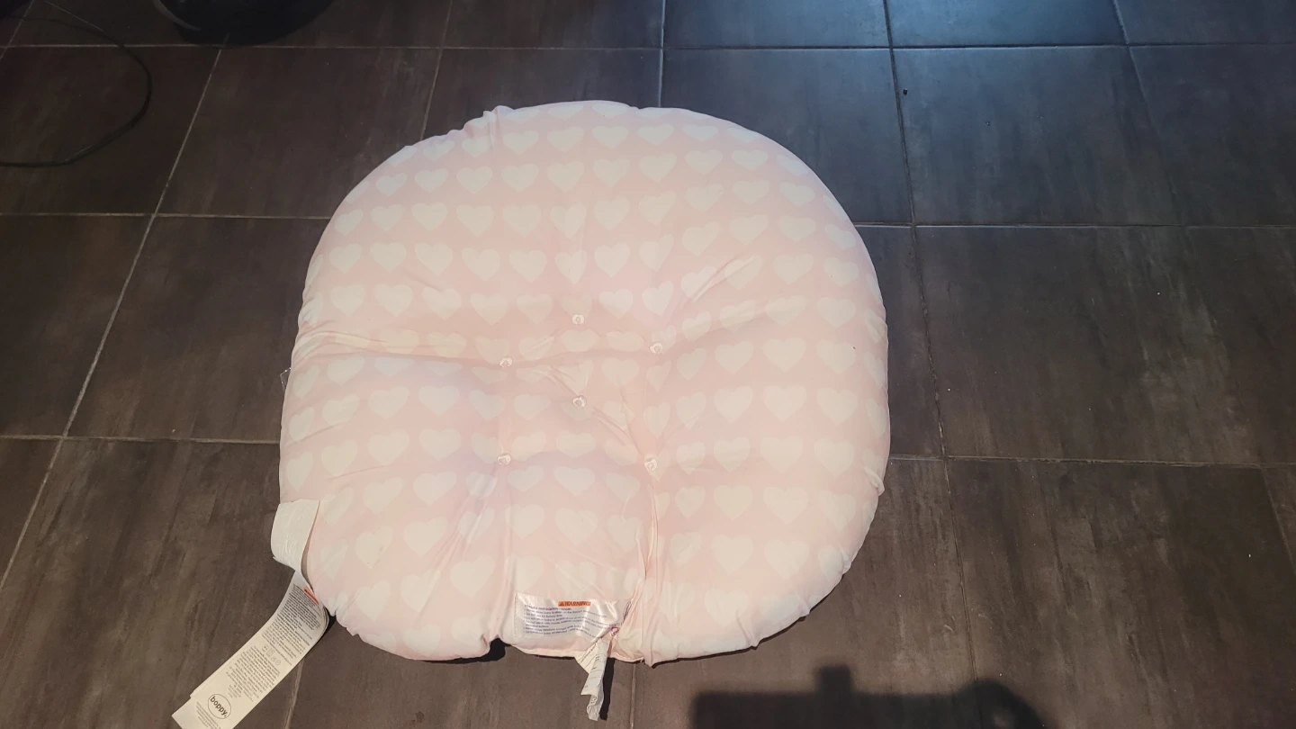 Selling a gently used Boppy Newborn Lounger with a pink and white heart pattern. It's in great condition and perfect for newborns. This lounger provides a comfy spot for your little one to relax!