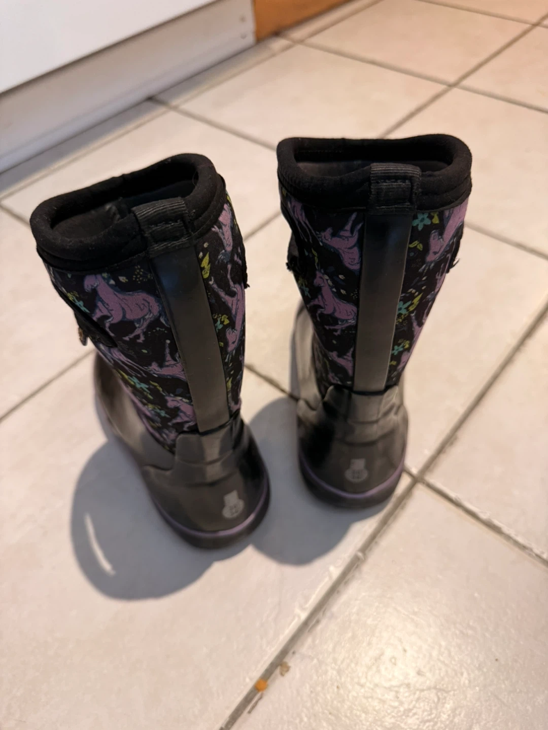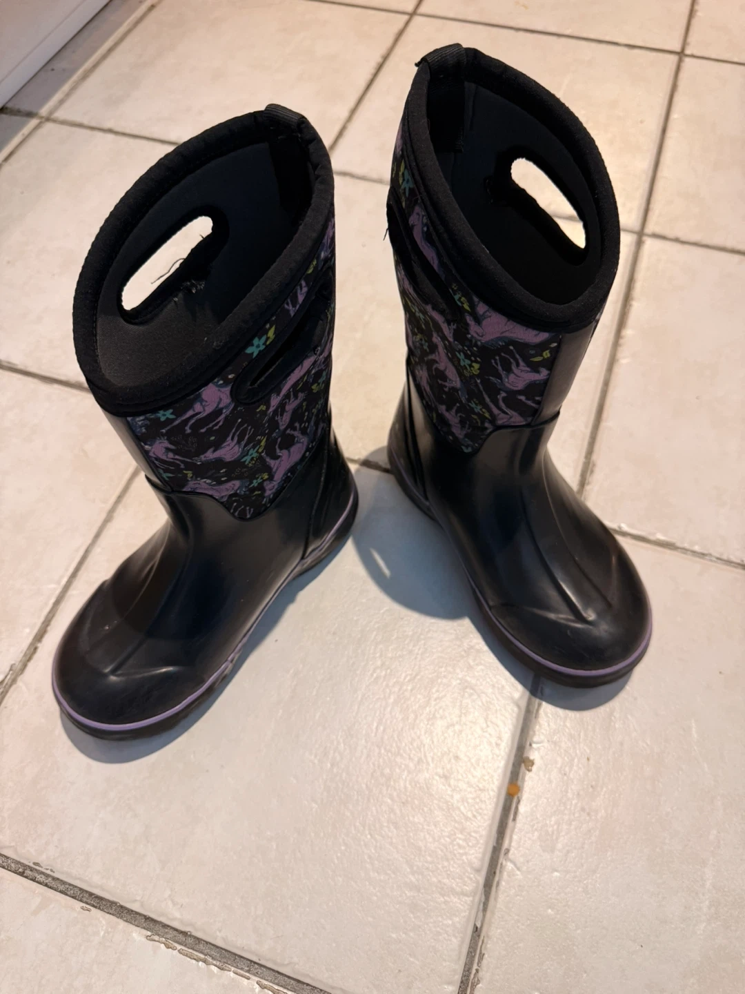 Bogs kids' rain boots in size 13. These boots feature a fun unicorn and floral pattern on a black background. Perfect for keeping little feet dry on rainy days!