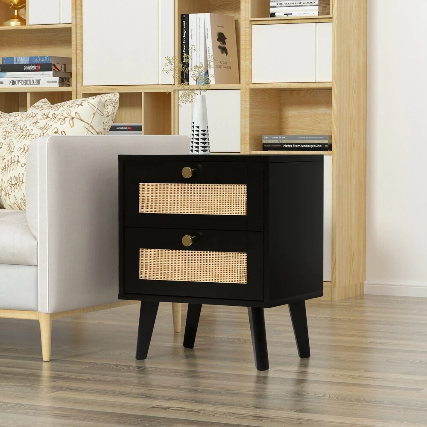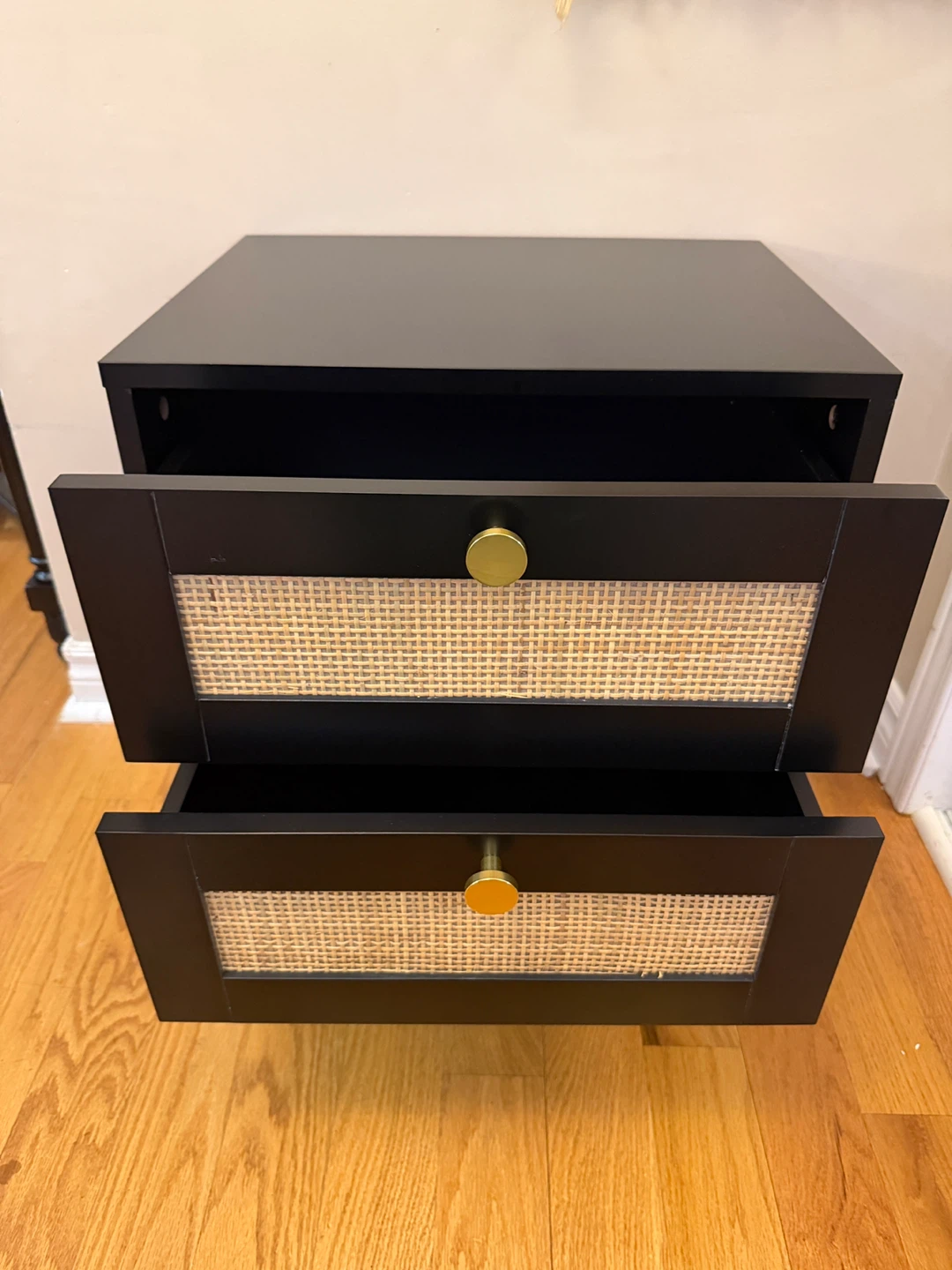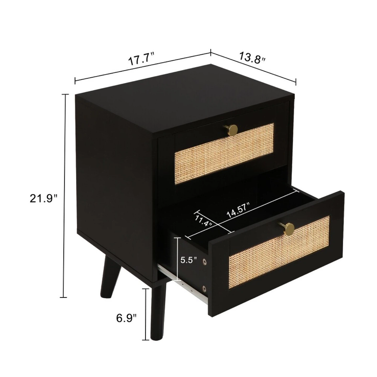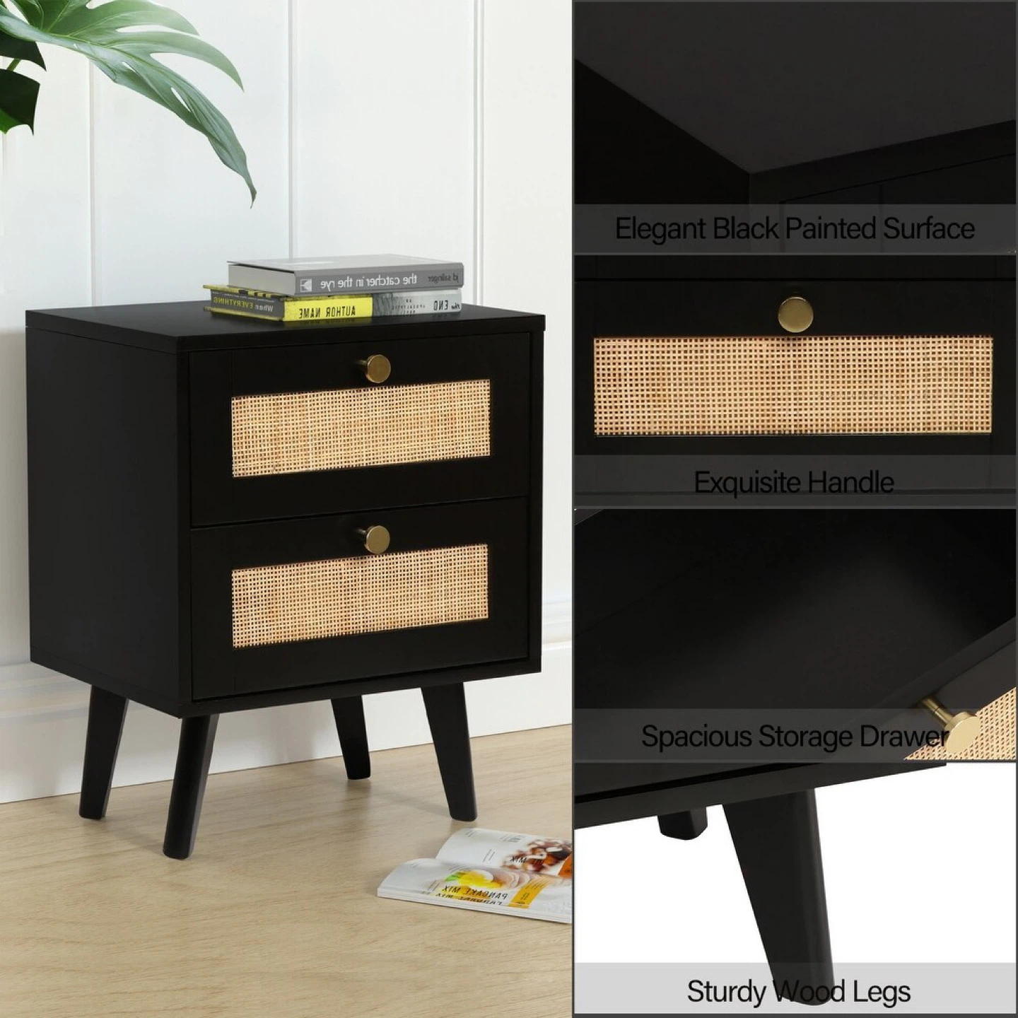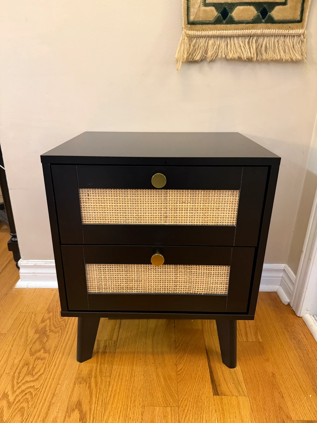This brand new fully assembled black nightstand features two drawers with a stylish rattan design, perfect for adding a touch of elegance to your bedroom!