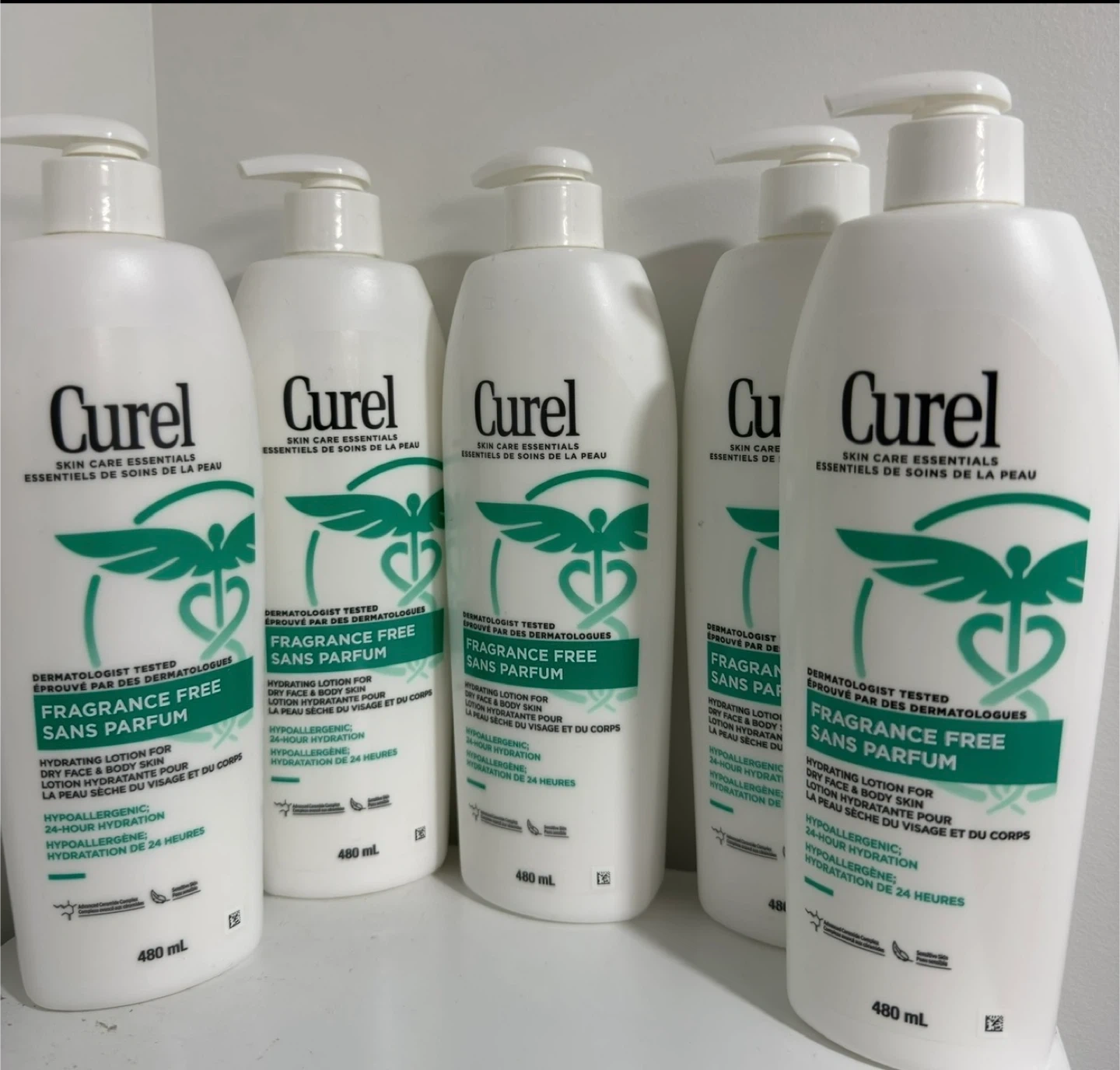 Curel Skin Care Essentials Fragrance Free lotion. This lotion is dermatologist tested and provides 24-hour hydration for dry face and body skin. It's hypoallergenic and comes in a 480 mL bottle