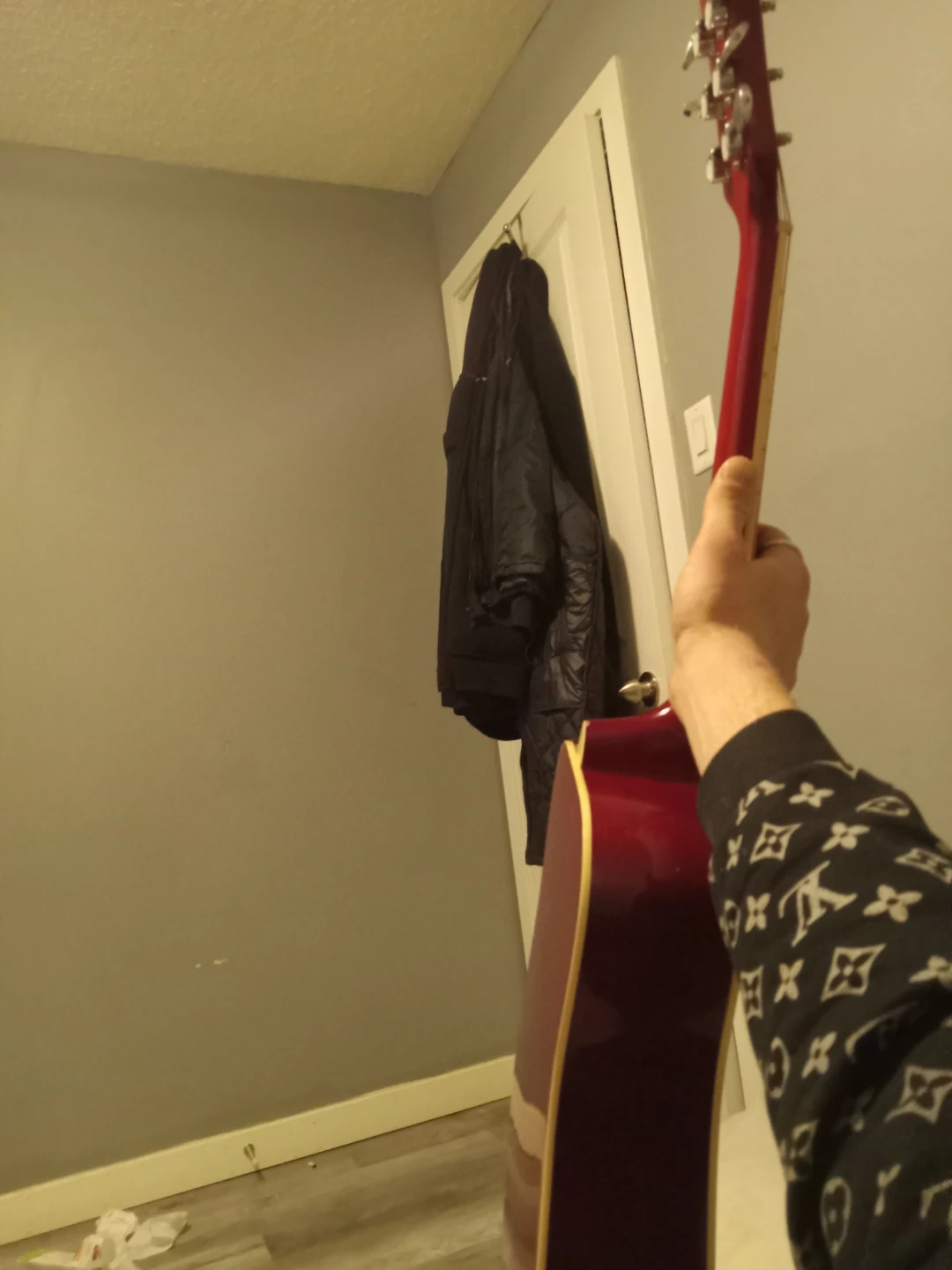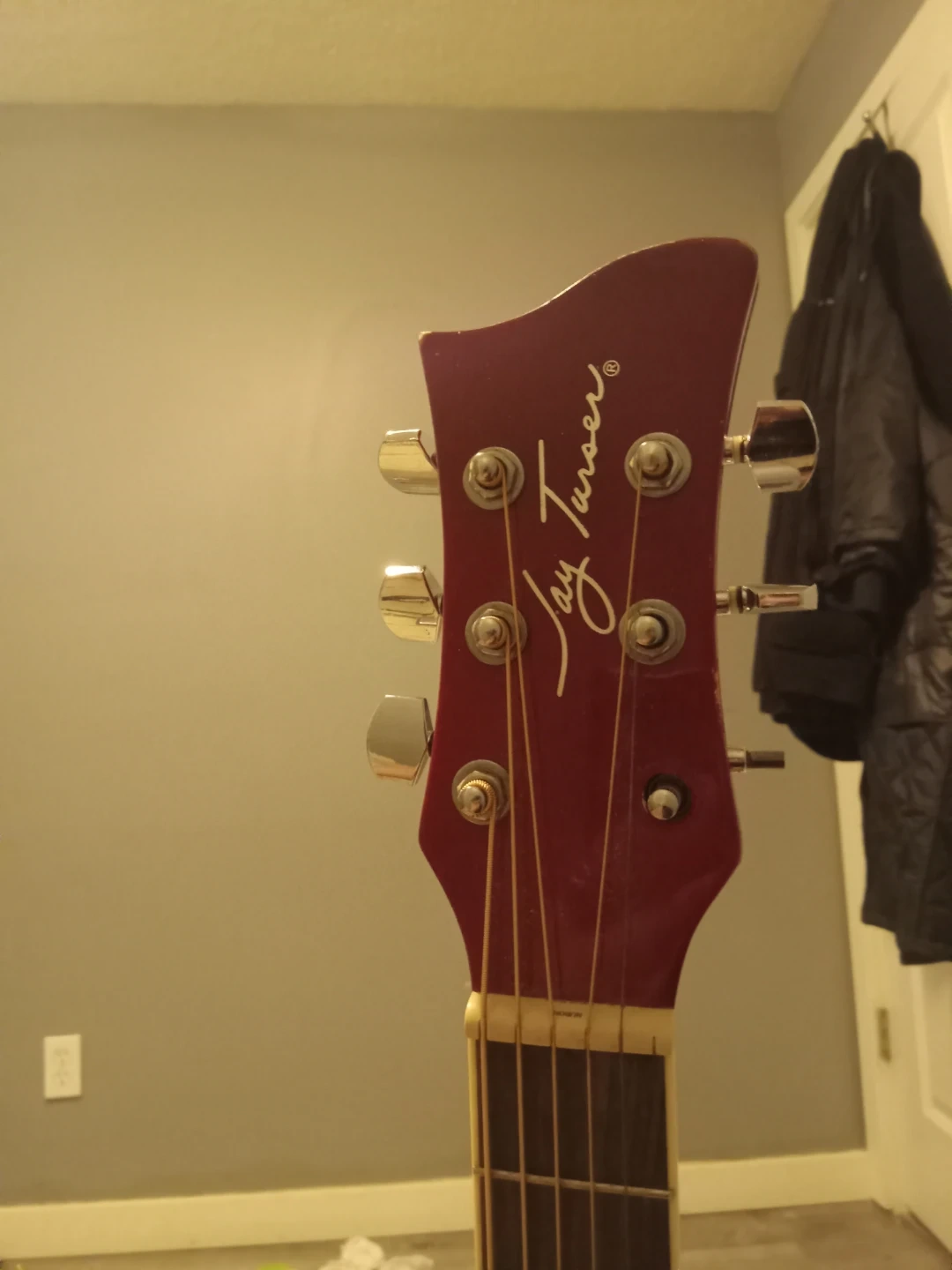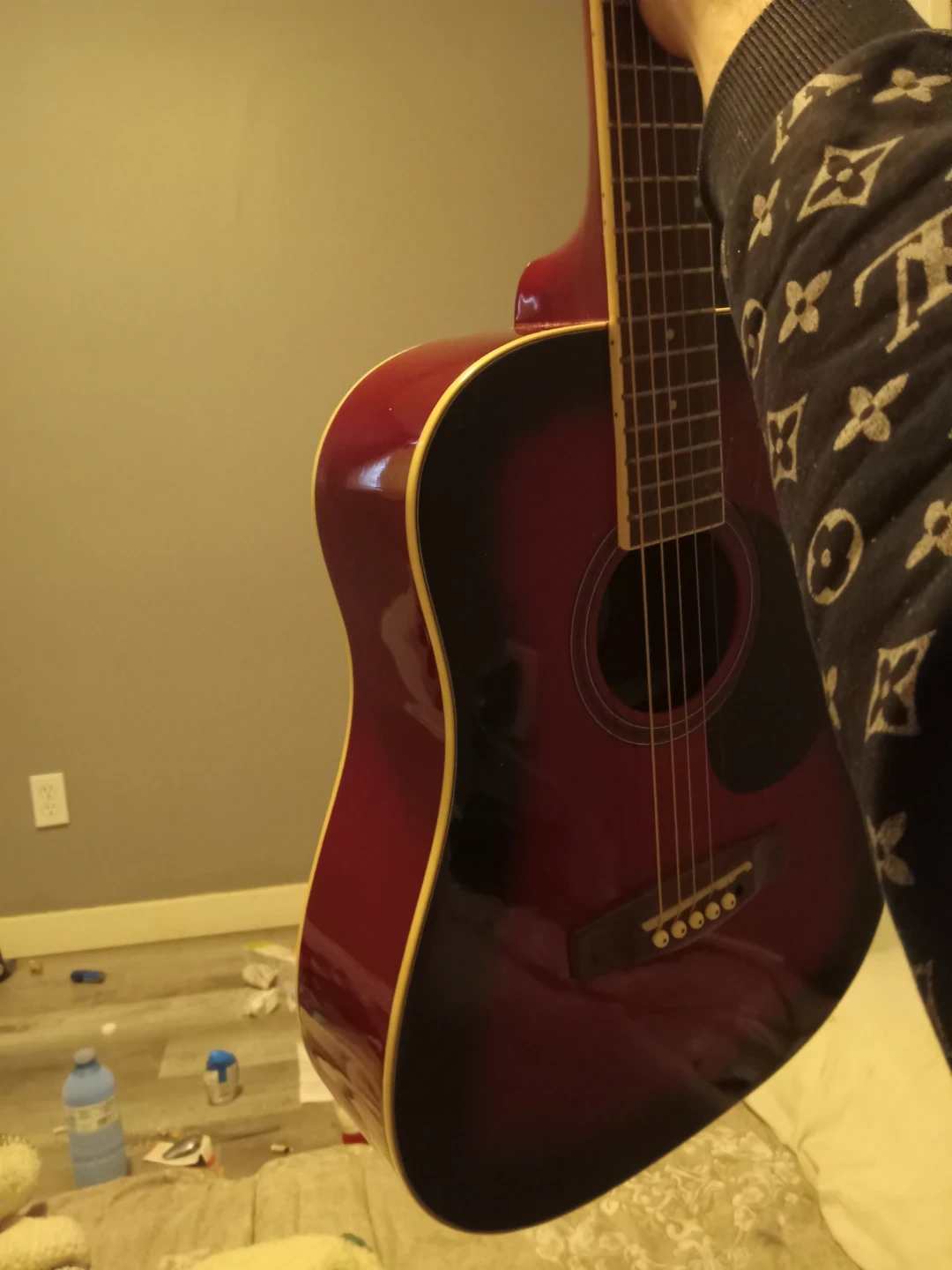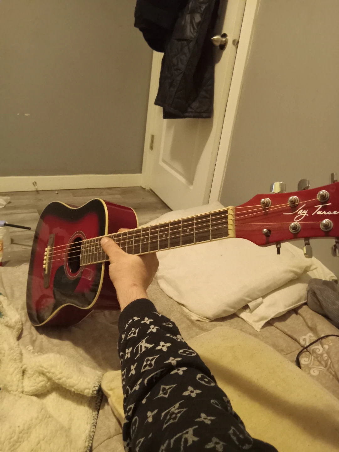 Selling a Jay Turser acoustic guitar in a striking red and black finish. It's a great instrument for beginners or anyone looking for a reliable guitar to play around with. The guitar is in good condition and ready to be played!