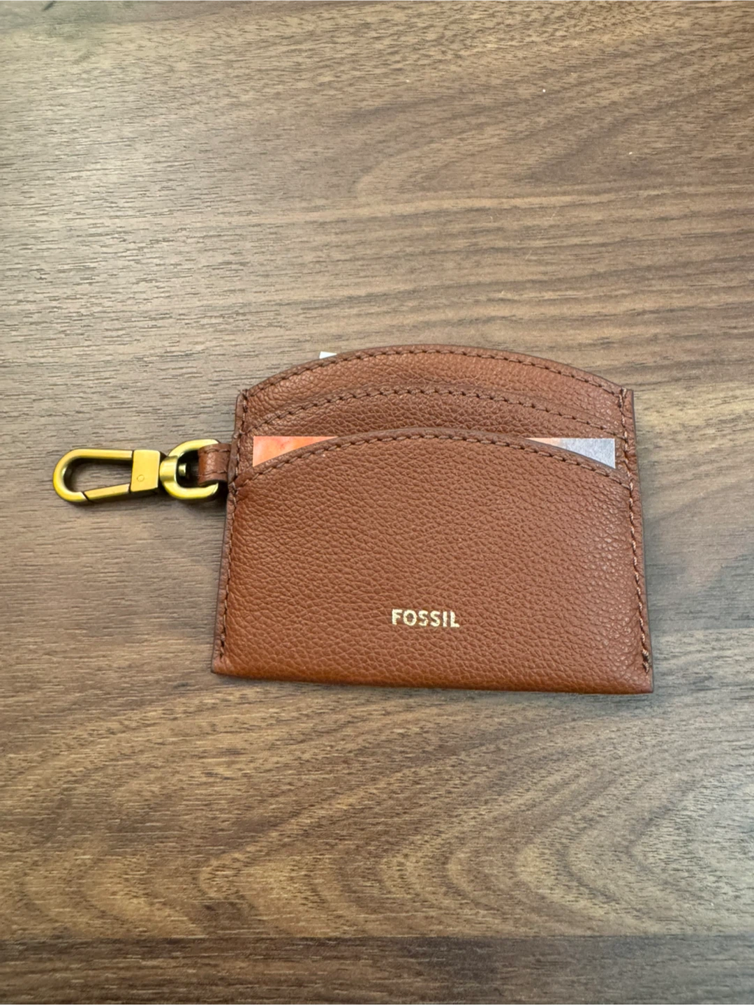 This is a Fossil card holder in brown leather. It's perfect for keeping your cards organized and easily accessible. The card holder also features a gold-tone clip.