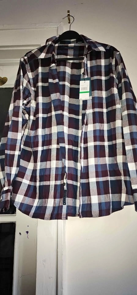 The pattern features a mix of burgundy, blue, and white colors and appears to be made from a fabric like cotton flannel, featuring a standard or spread collar and a full button-down placket.