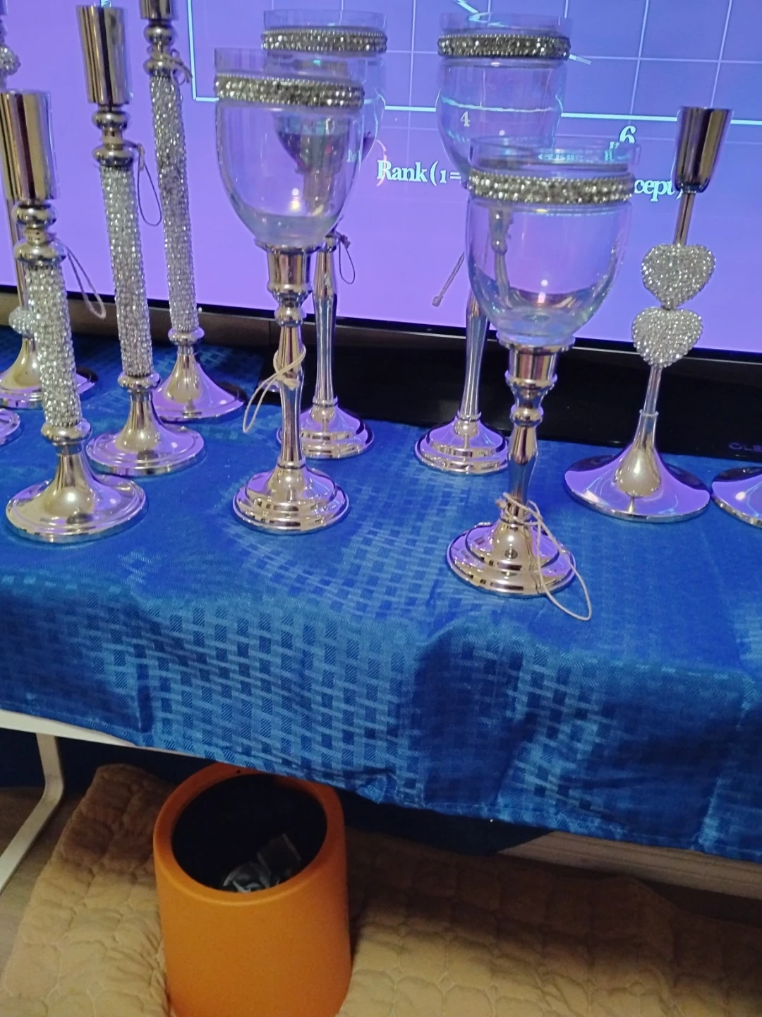 • Multi-piece ensemble including tall candelabras, goblet-style hurricanes, and sculptural decorative holders
