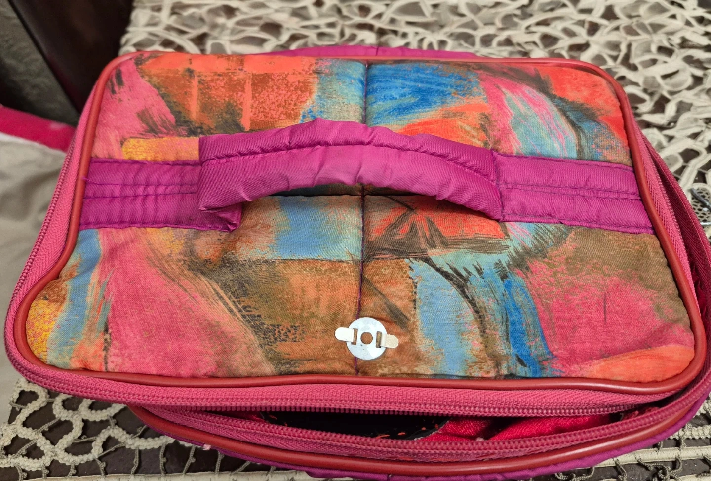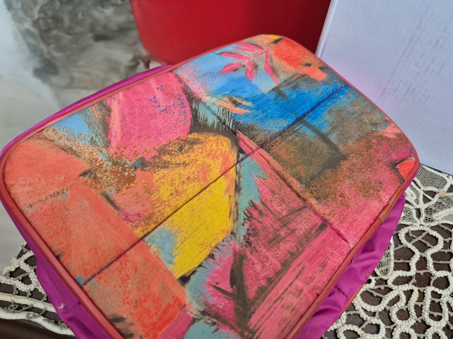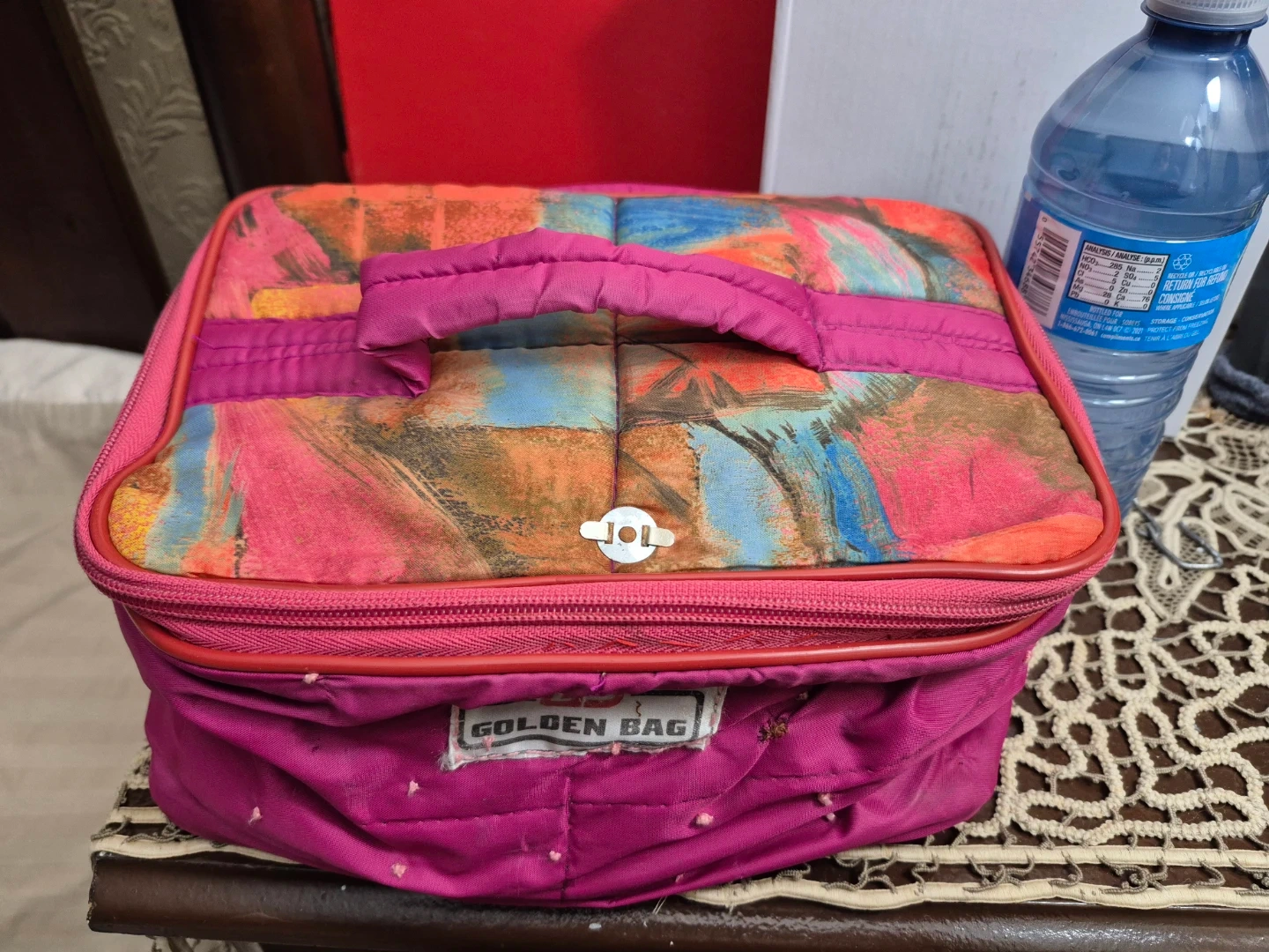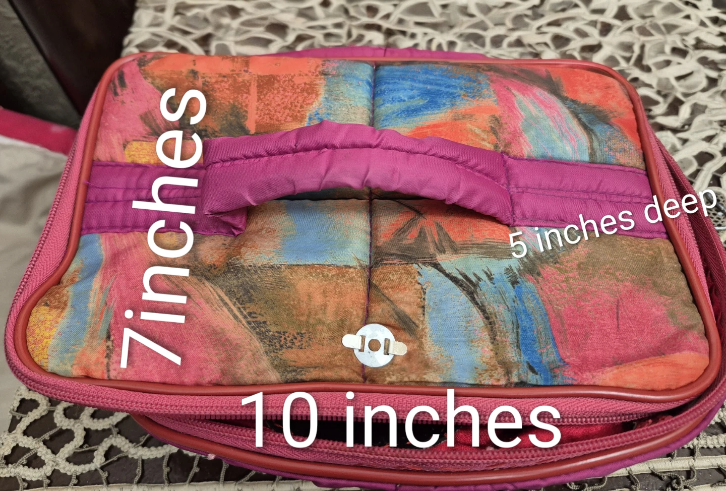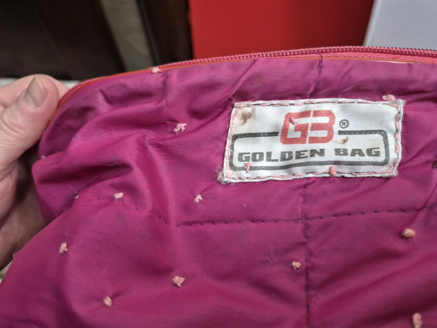 This Golden Bag cosmetic case is perfect for travel or home organization! It features a vibrant, colourful design and a convenient handle.