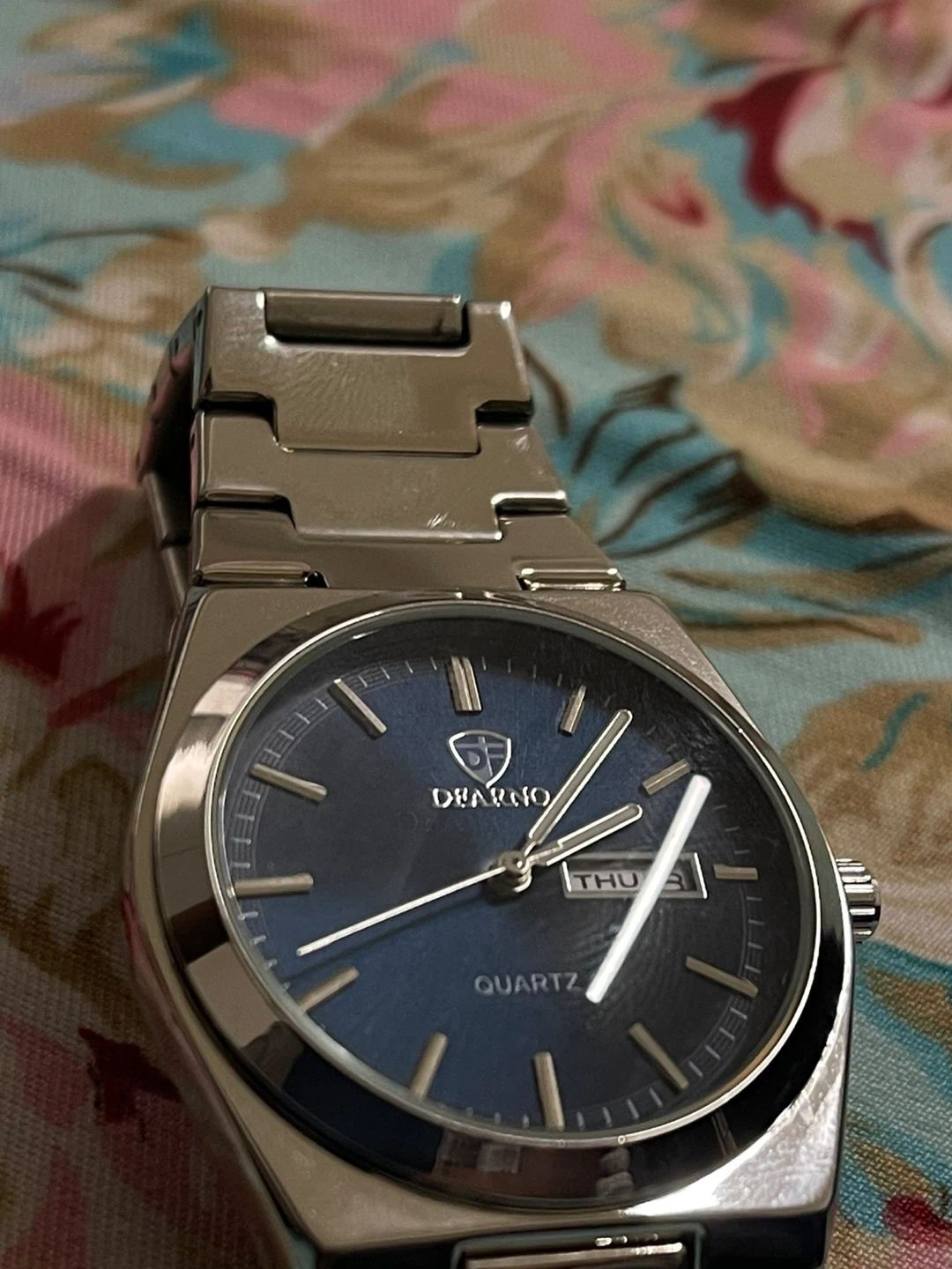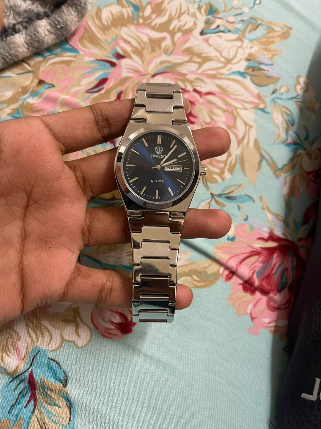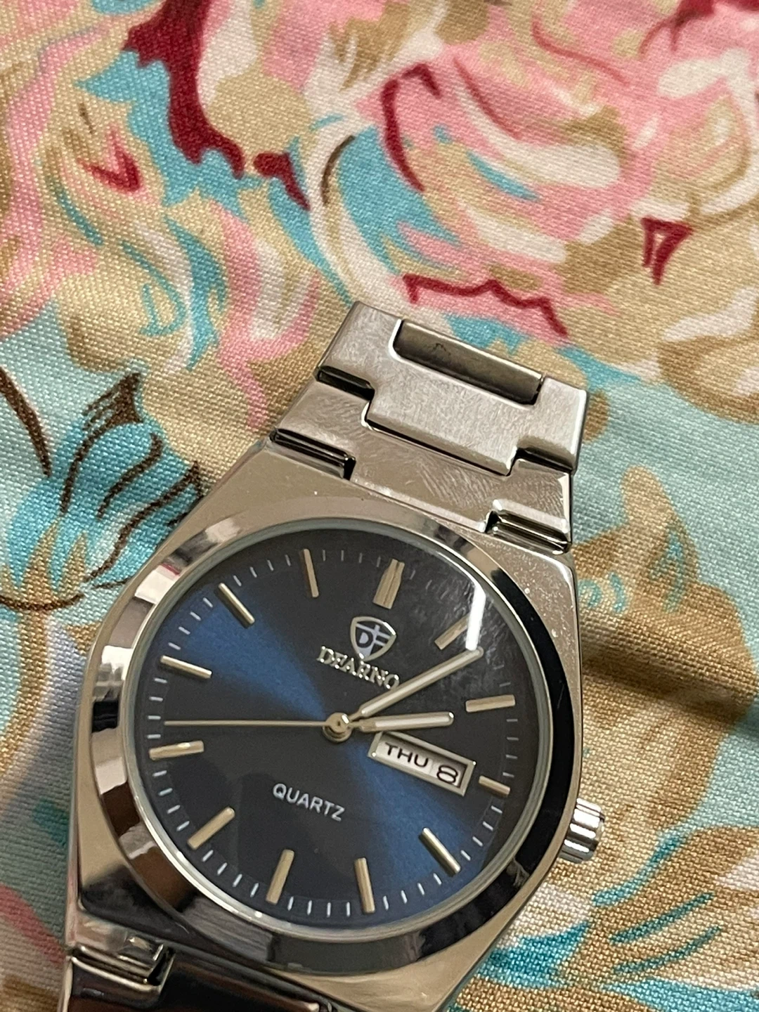 Selling a DEARNO quartz watch in silver! The watch has a blue face and a stainless steel band. It's in great condition and ready for a new wrist!